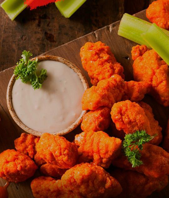 1 kilo de boneless bañados en tu salsa preferida, con papas y verduras.
