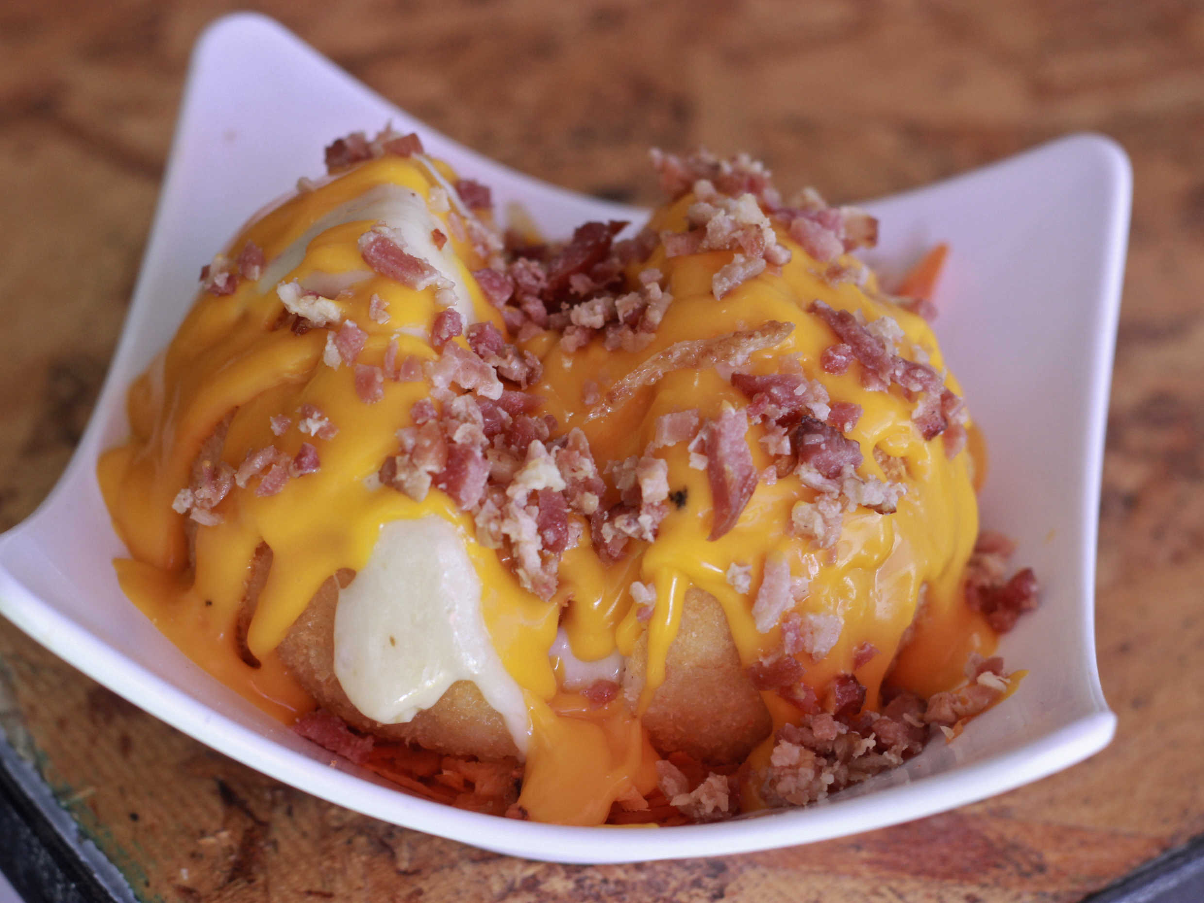 Bola de arroz empanizada con sirloin, cebolla caramelizada, aguacate, philadelphia, salsa de queso amarillo, queso gratinado y tocino.