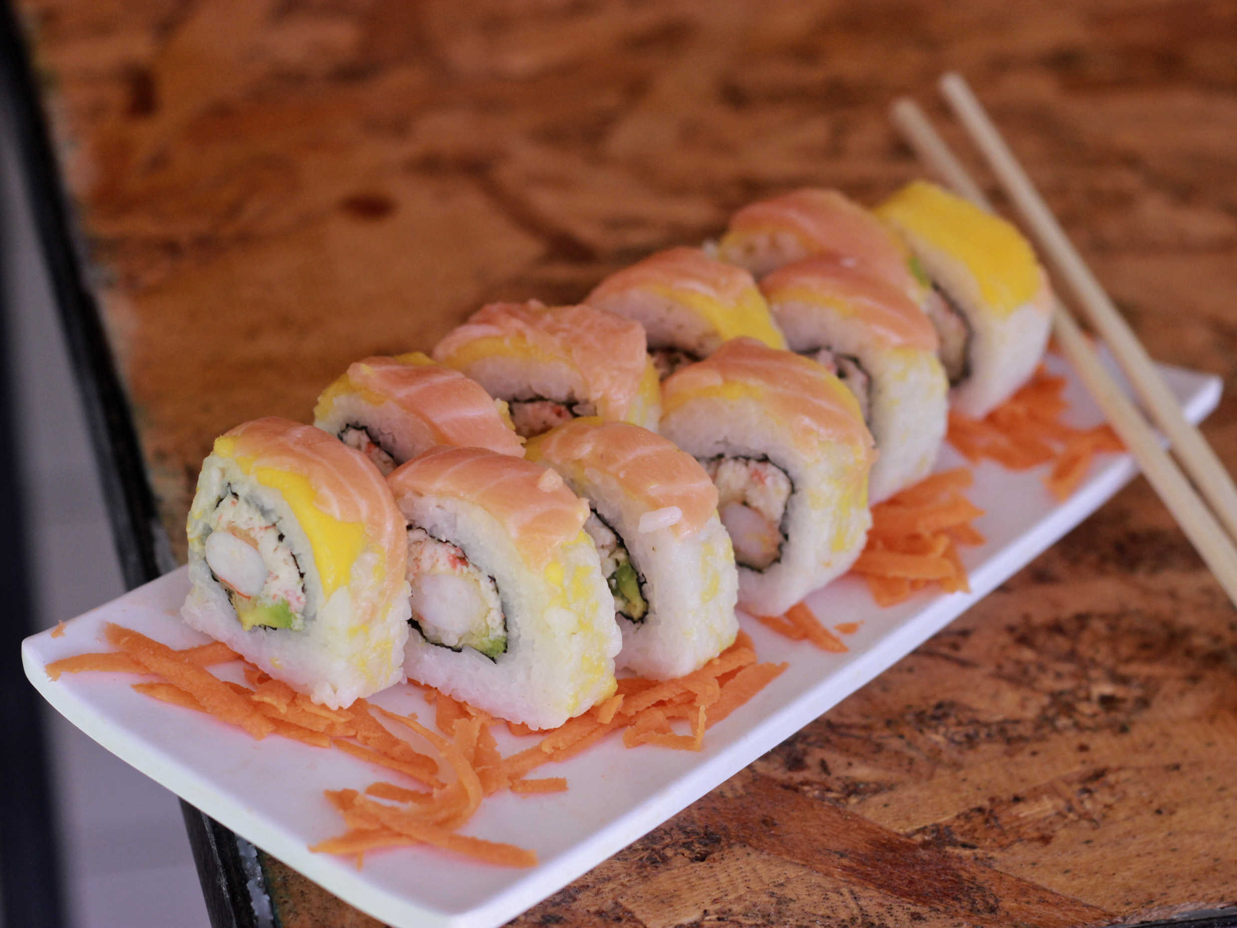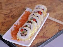 Rollo fresco adentro salmón Philadelphia y aguacate, por fuera; mezcla de kanicama, camarón y almeja, aderezados con salsas especial picante y horneado.