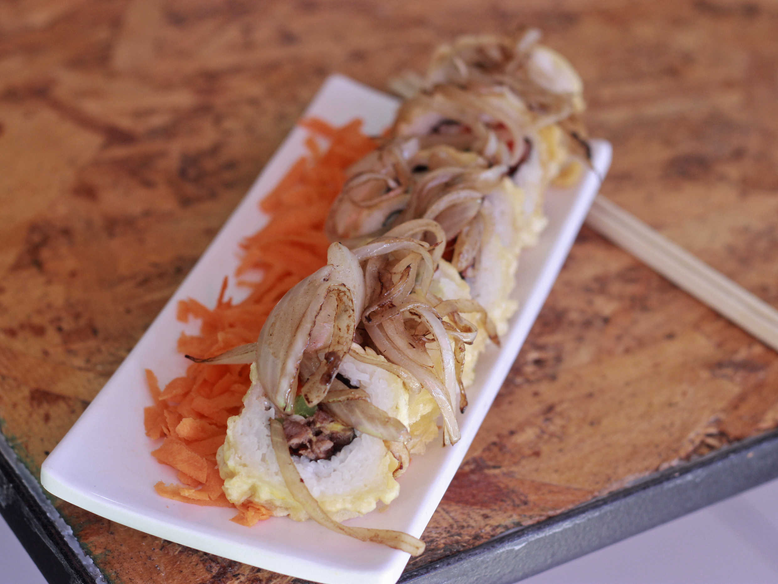 Rollo tempura con carne asada, salchicha, roja, queso gratinado, chile california, aguacate encima y cebolla asada.