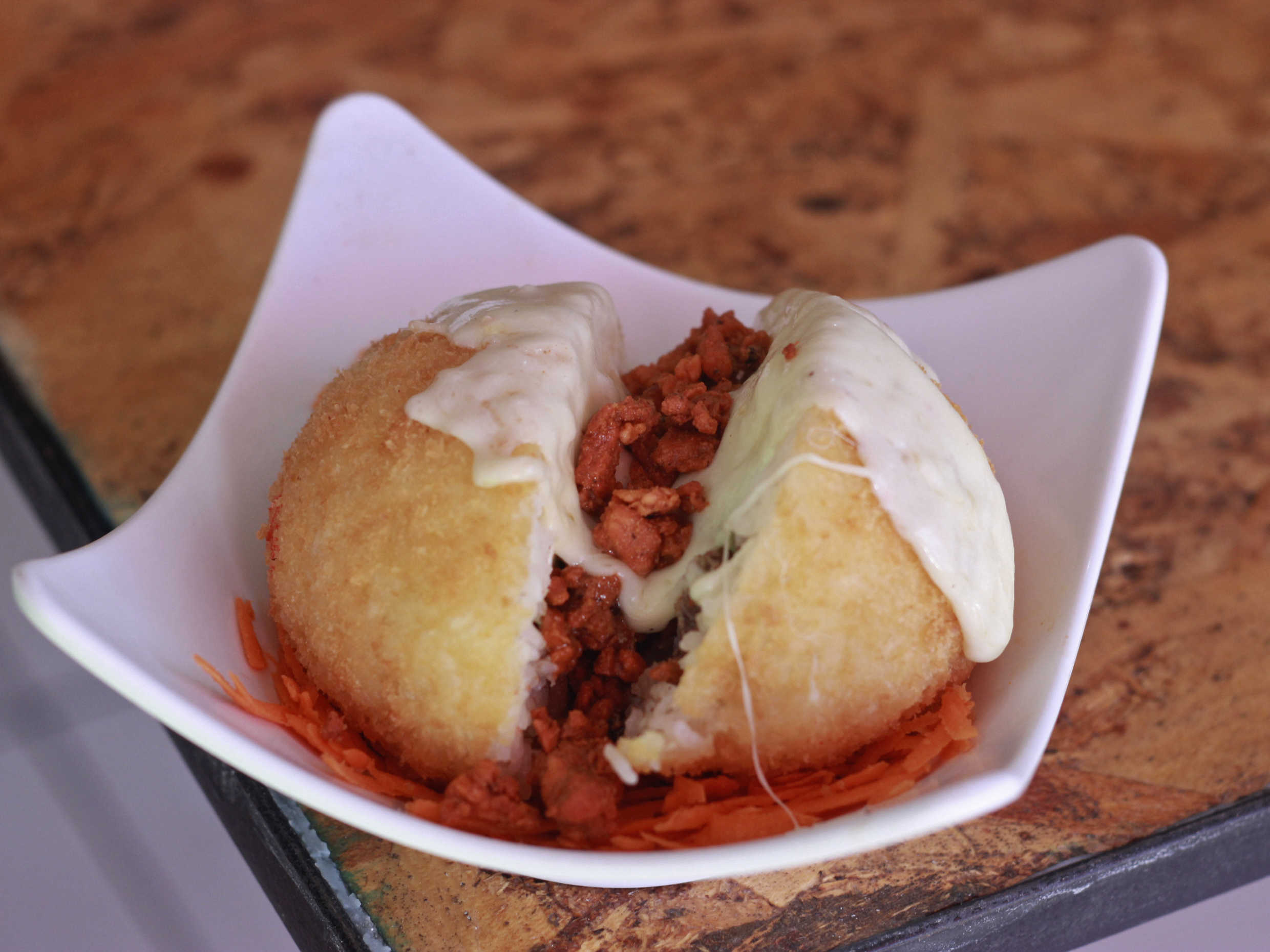 Bola de arroz empanizada con carne al pastor, cebolla, morrón, tocino, piña, aguacate y queso gratinado.