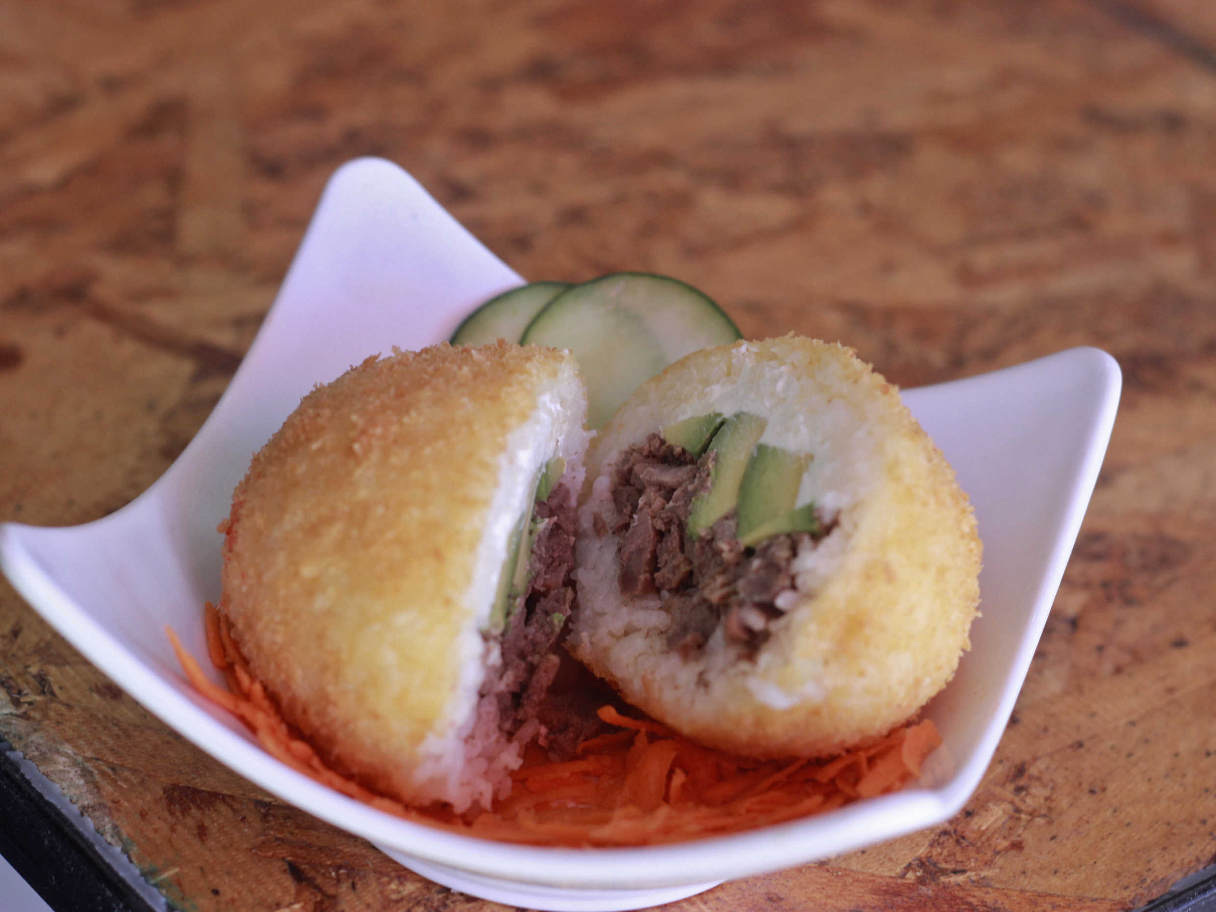 Bola de arroz con tres proteínas y tu aderezo favorito acompañado de Philadelphia, aguacate o pepino.
