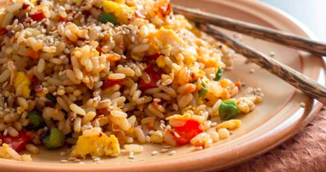 Arroz frito con calabaza, zanahoria y cebollín.