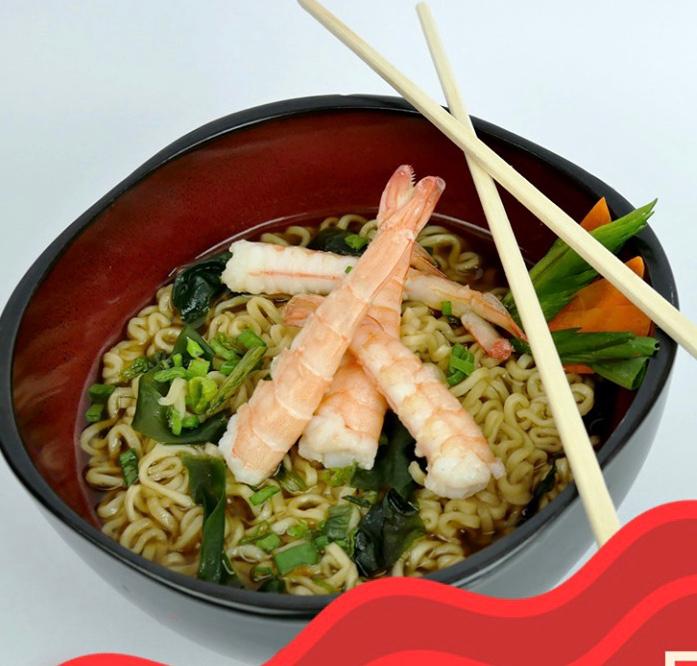 Fideos ramen servido con proteína a elegir, wakame, cebollín y zanahoria.