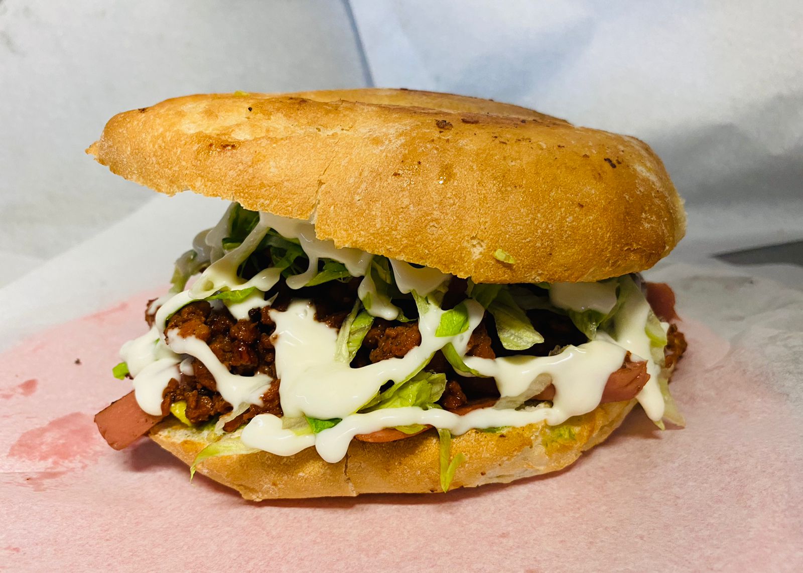 deliciosas 3 carnes conbinadas colita de pavo, pastor, bistec, 🧀 selecto derretido, jamon, aguacate, lechuga, y aderezos