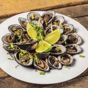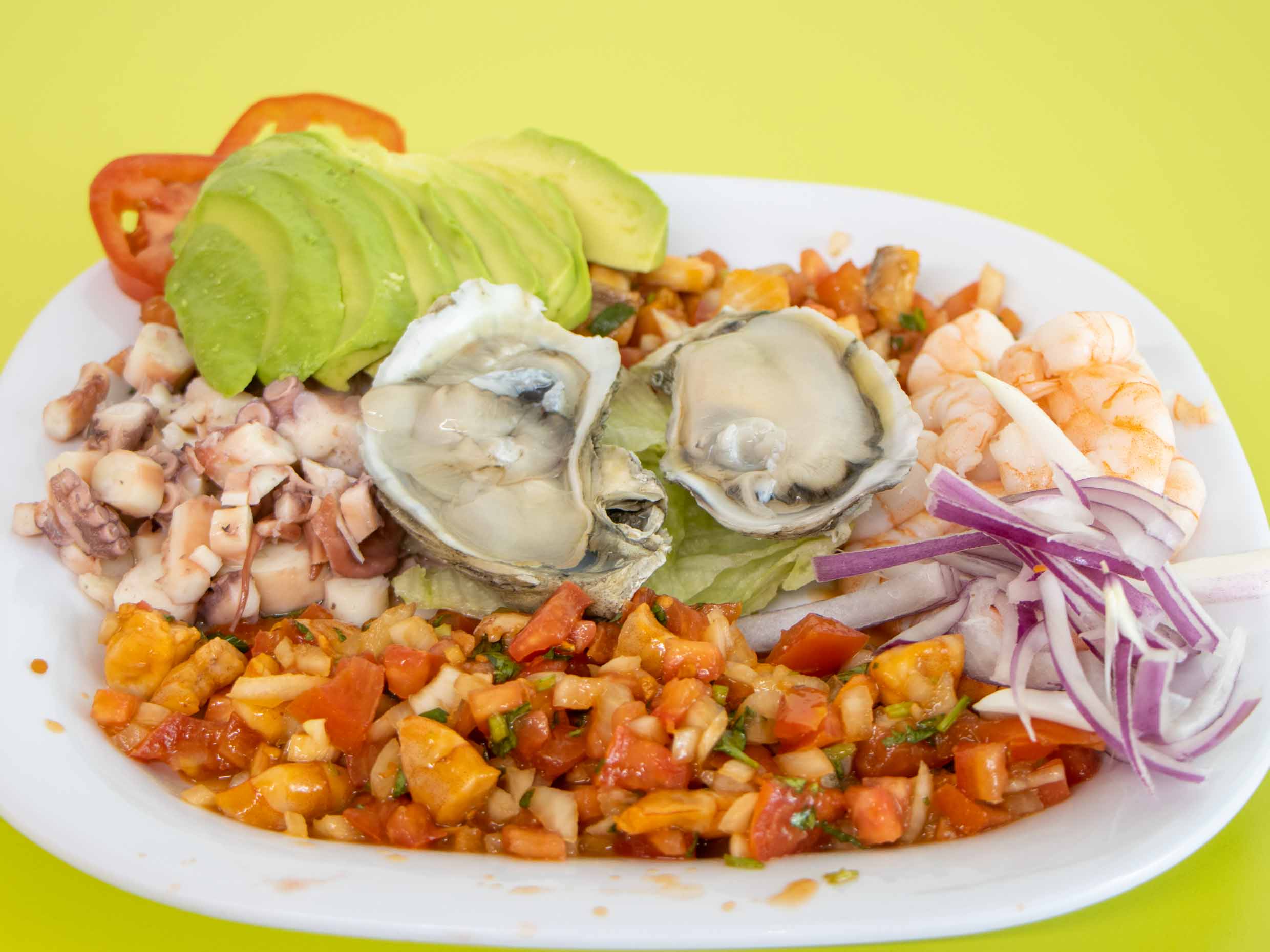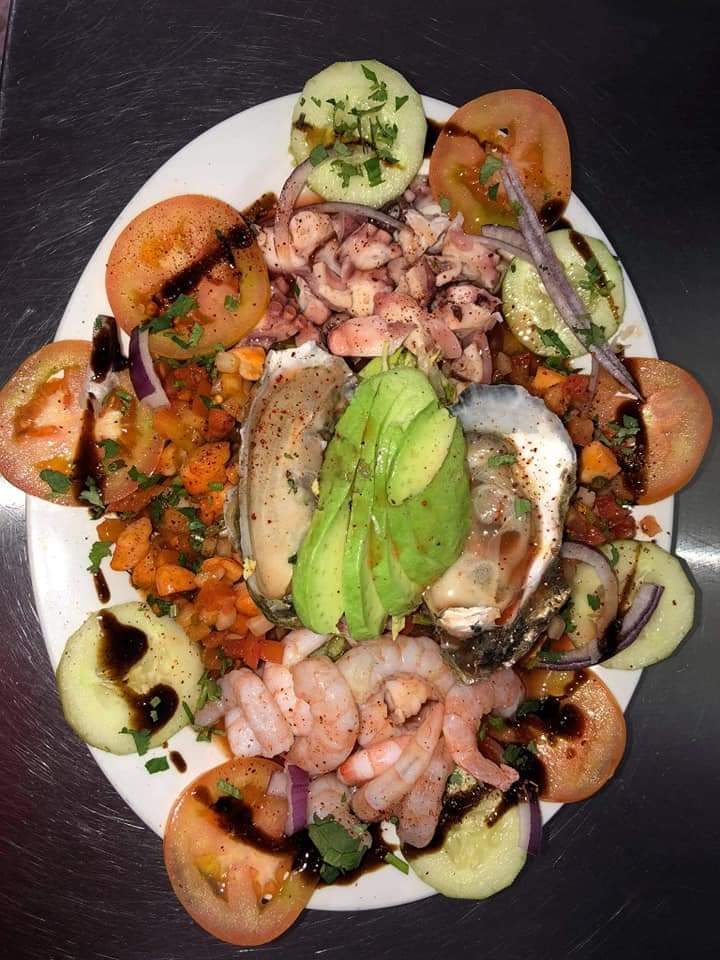 Pulpo, camarón, ceviche camarón, ceviche pescado, ostión concha, aguacate.