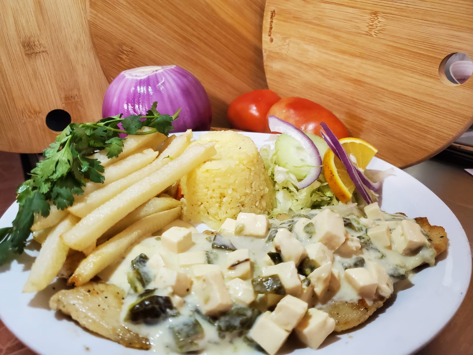Filete, papás fritas, lechuga, tomate, cebolla, naranja, pepino, arroz blanco, bañado en salsa con crema jalapeño y queso panela.