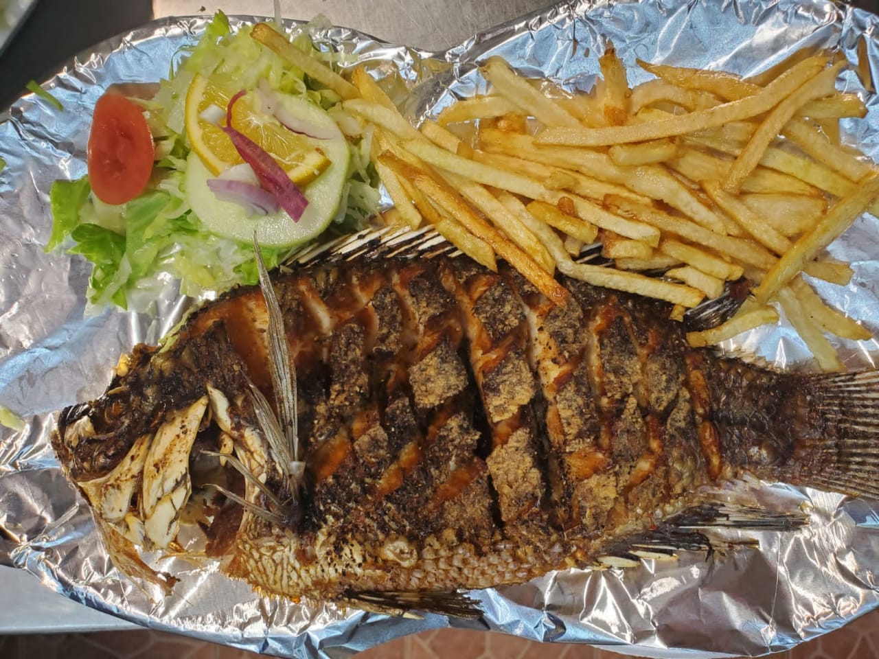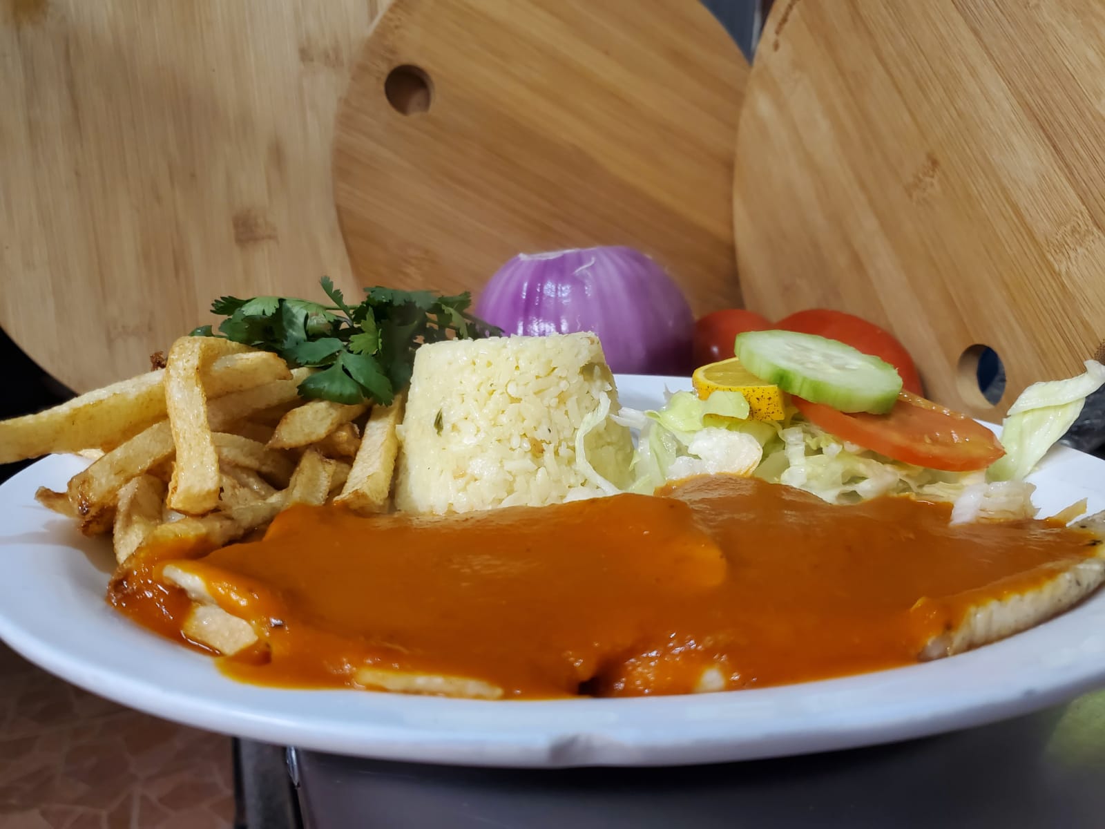 Filete Bañado en salsa michoacana, papas fritas, lechiga, tomate cebolla, naranja, pepino, arroz