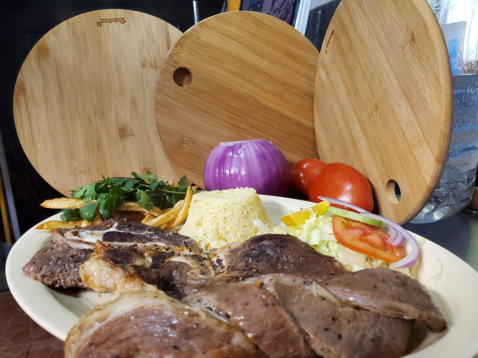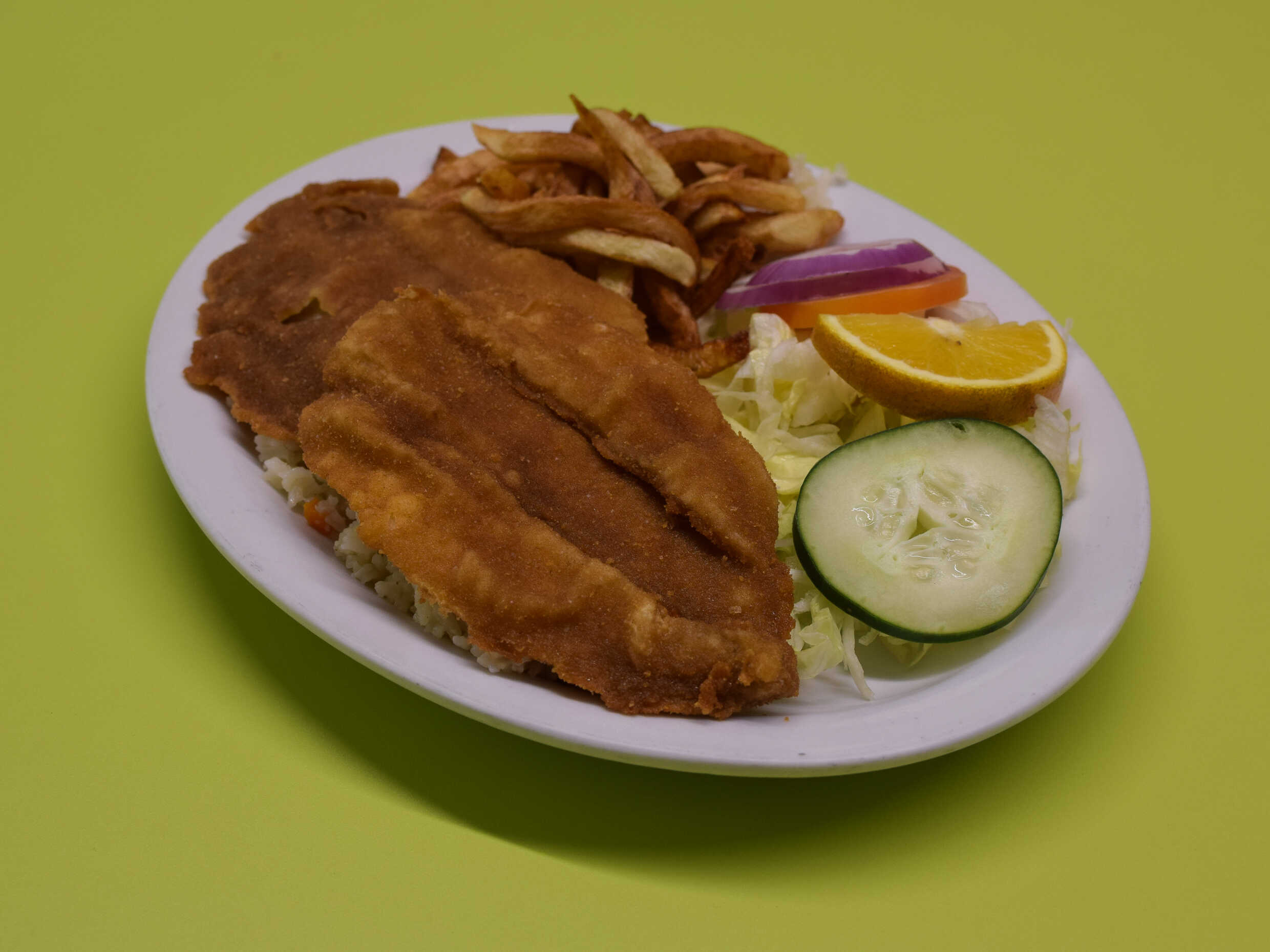 Filete, papás fritas, lechuga, tomate, cebolla, naranja, pepino, arroz blanco.