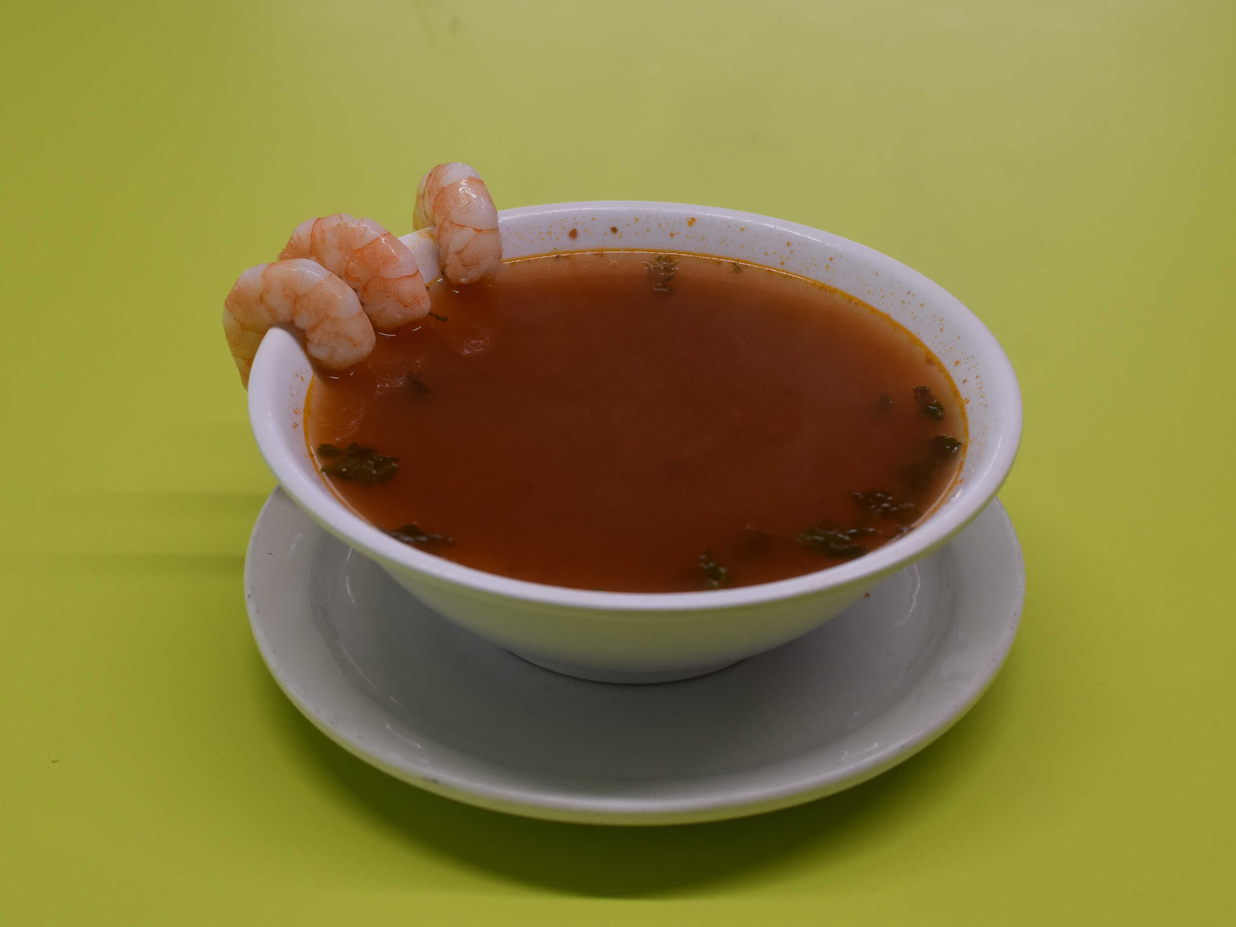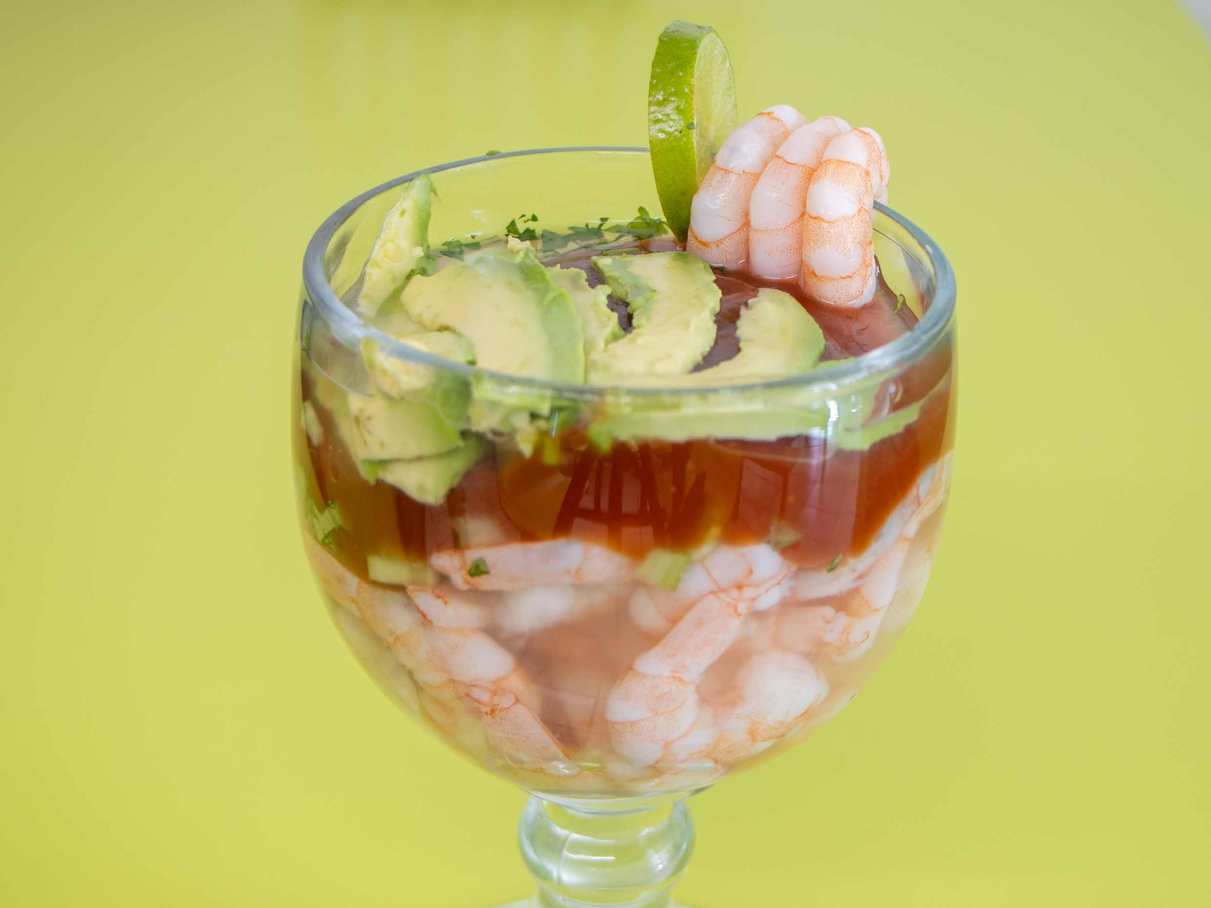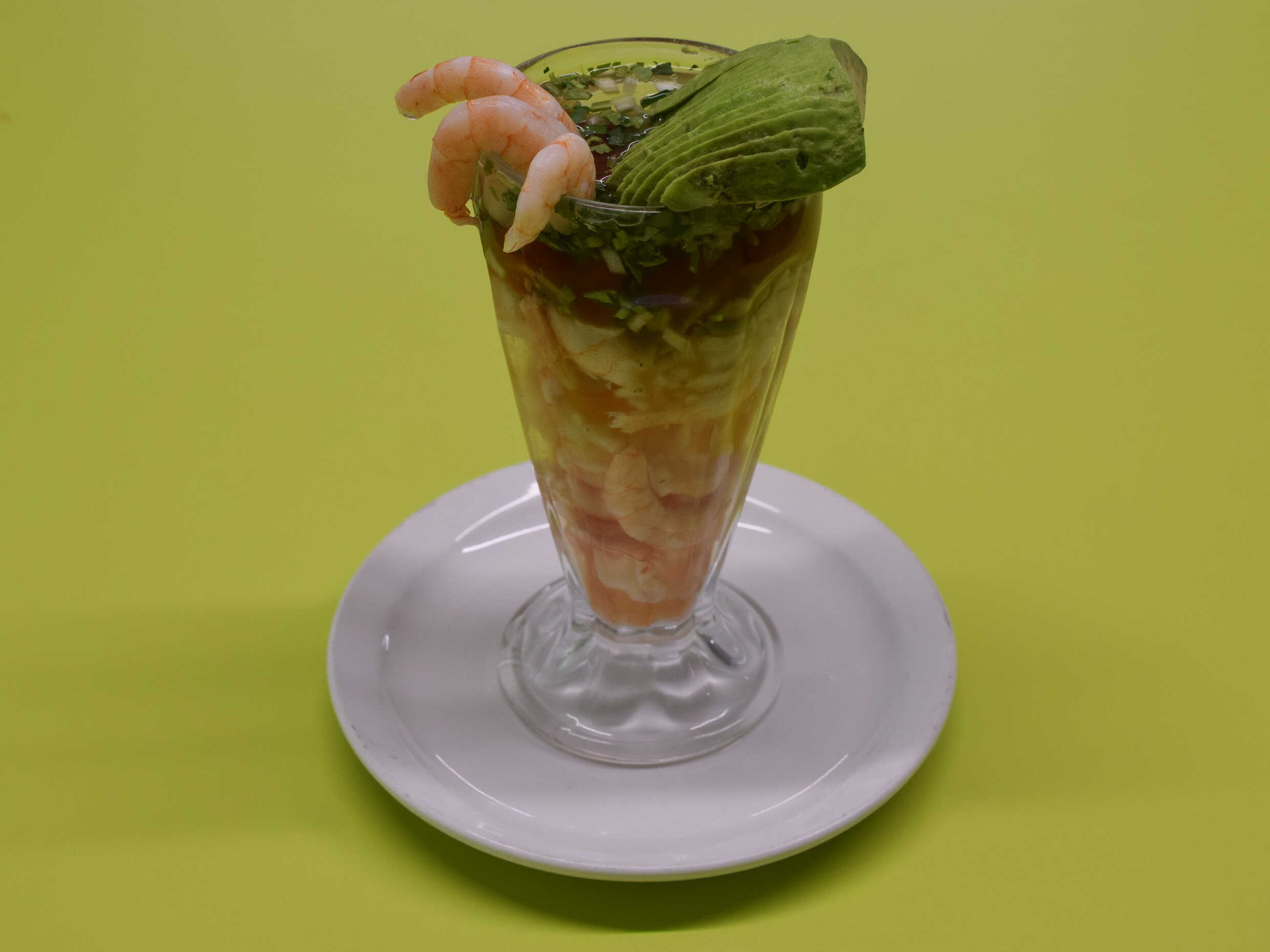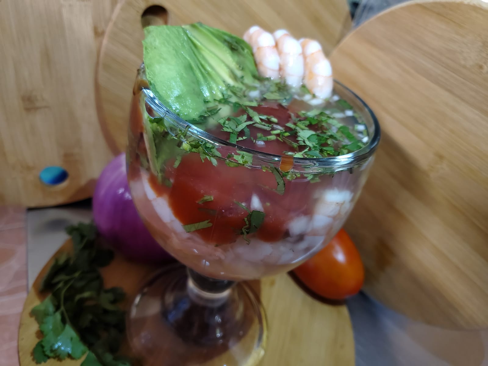 Camarón, cebolla, apio, cilantro, aguacate, cátsup.