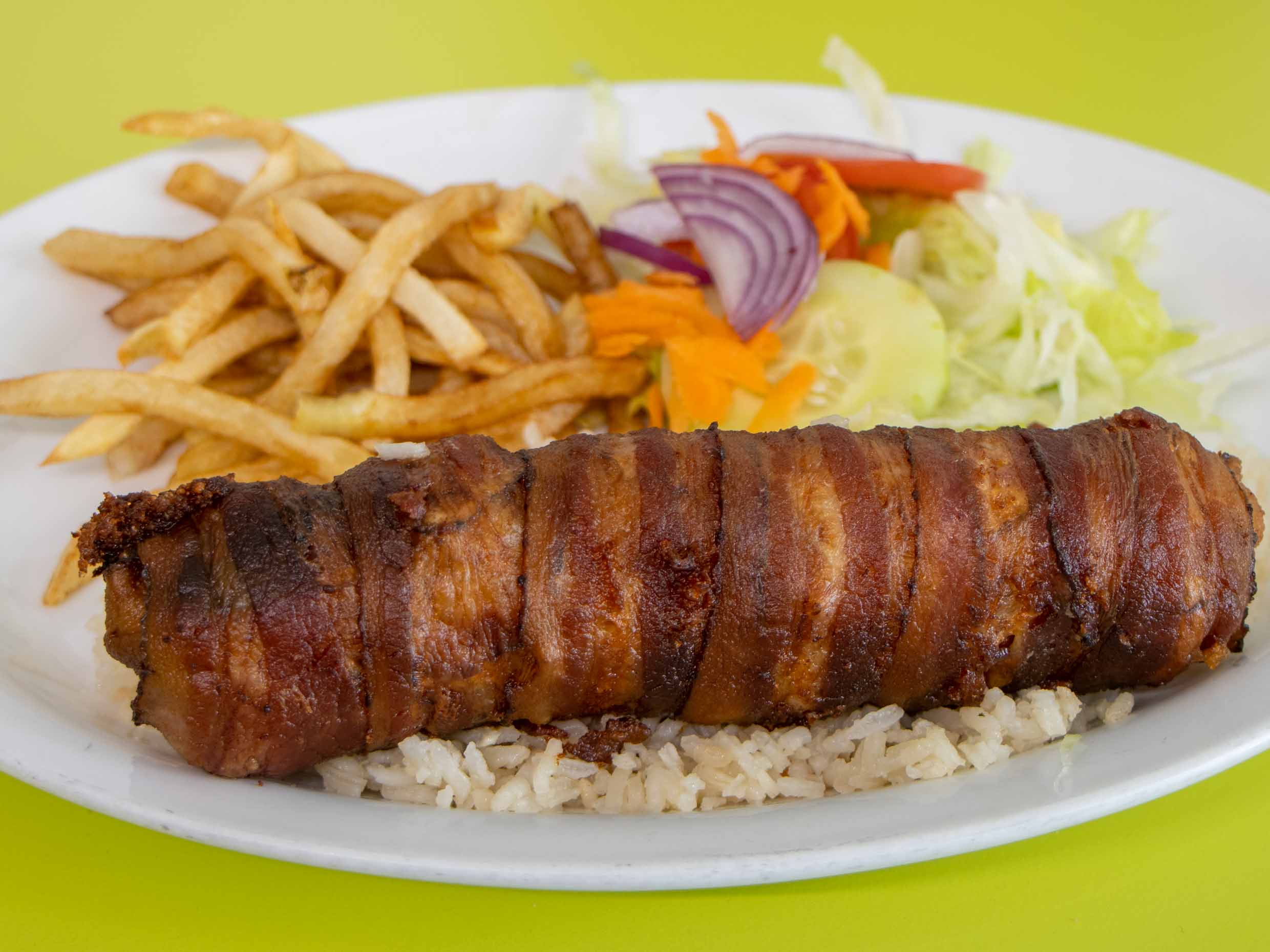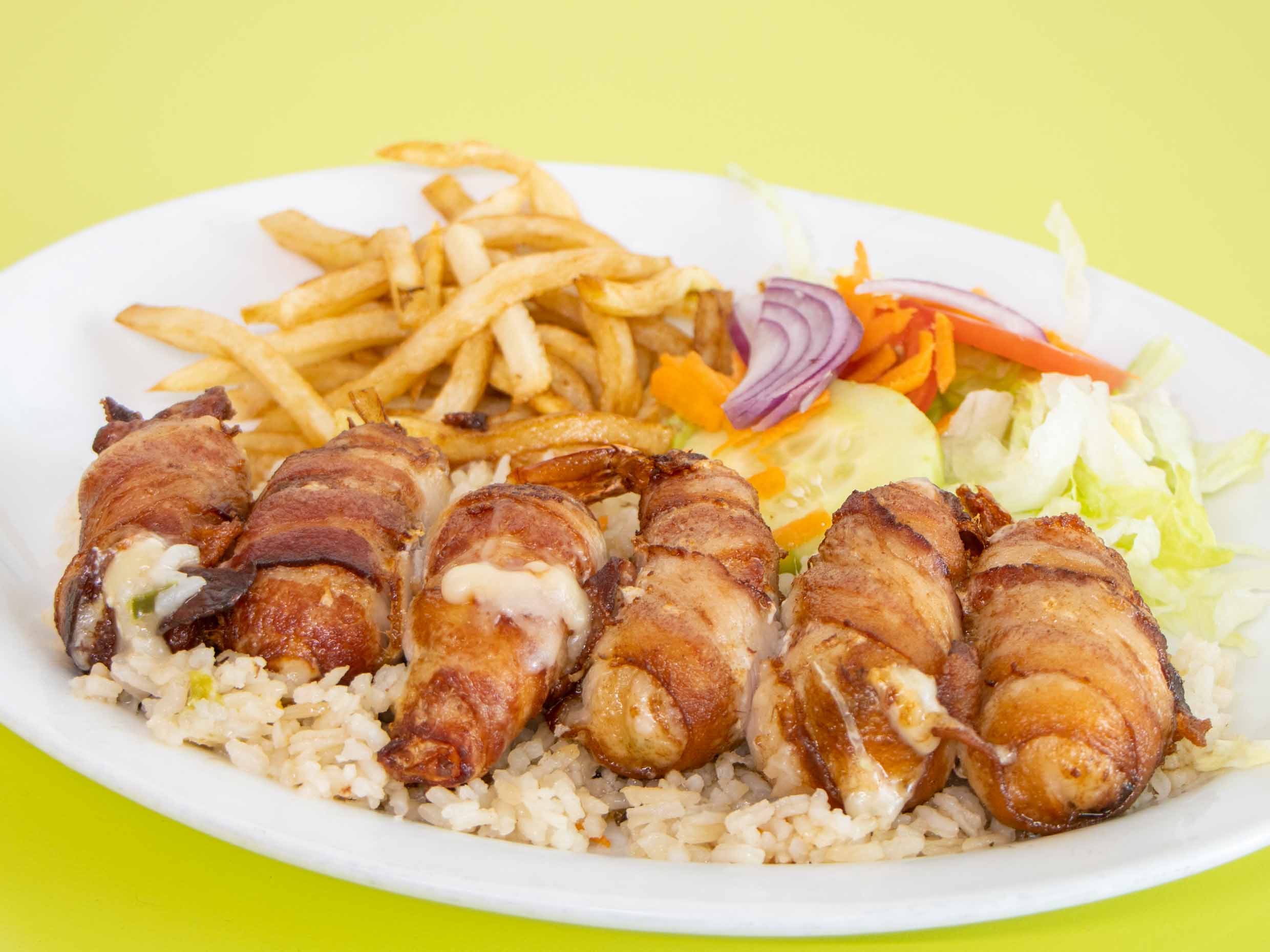 Camarones con queso enredados en tocino, papás fritas, lechuga, tomate, cebolla, naranja, pepino, arroz blanco.