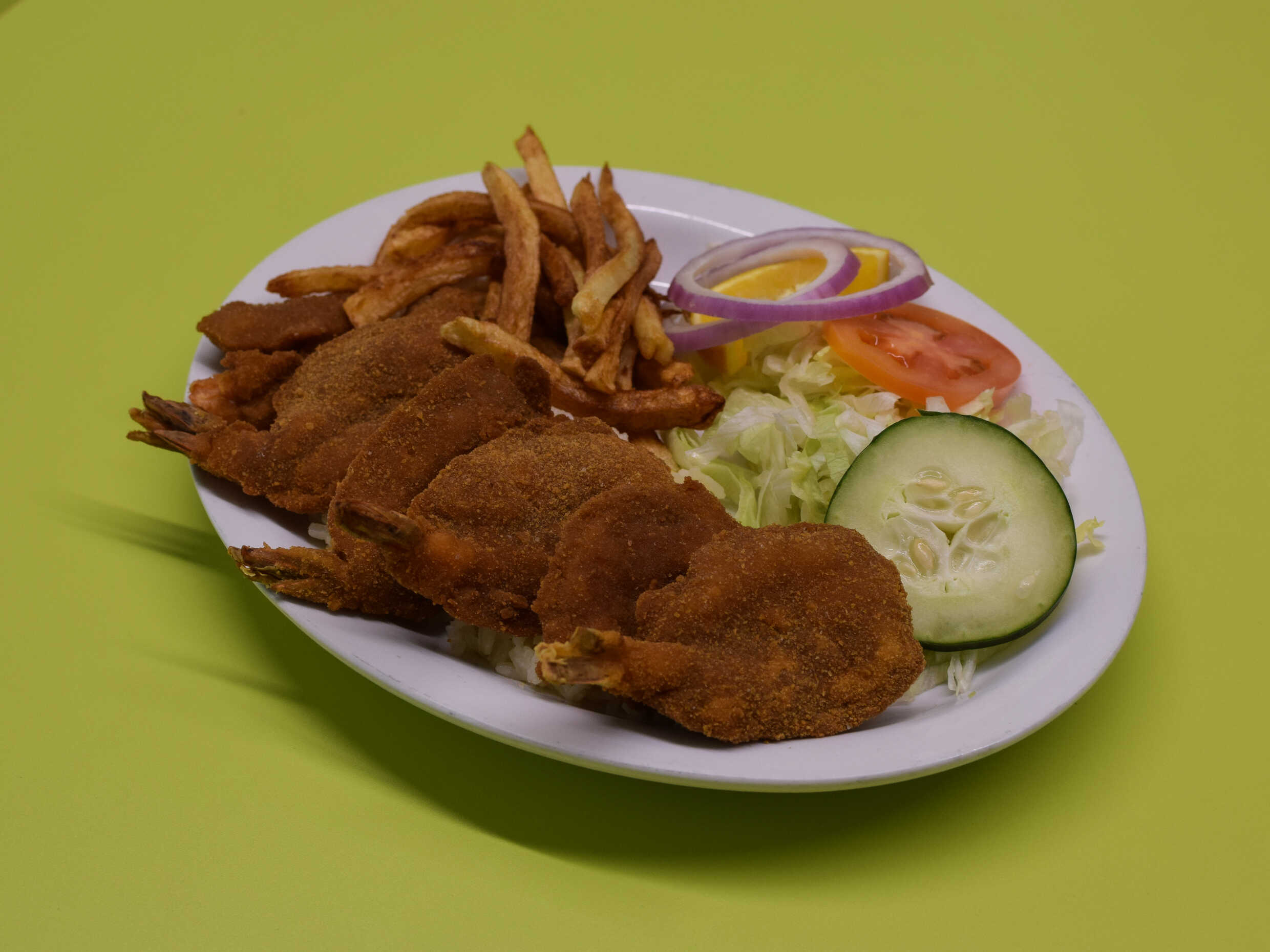 Camarones, papás fritas, lechuga, tomate, cebolla, naranja, pepino, arroz blanco.