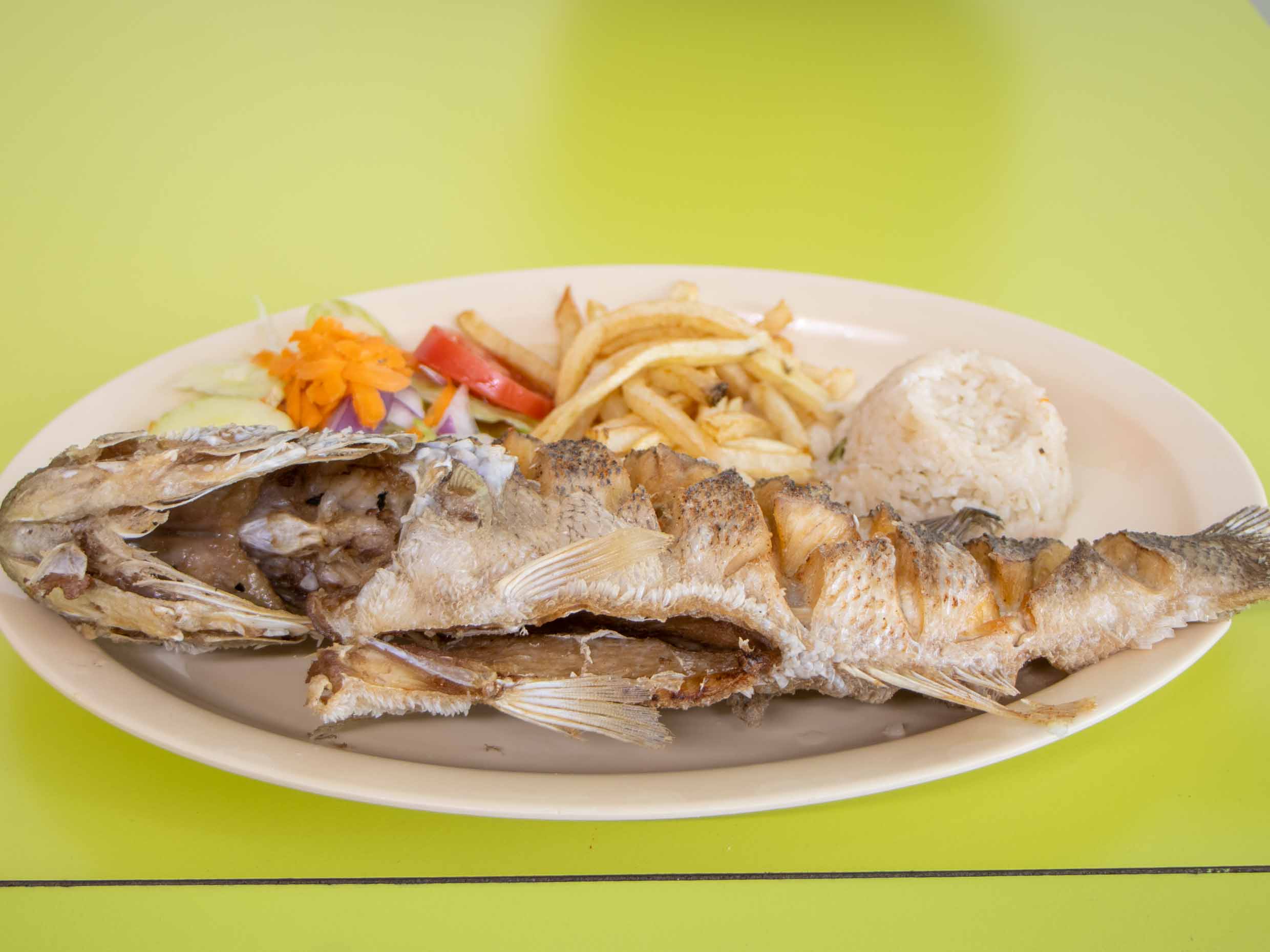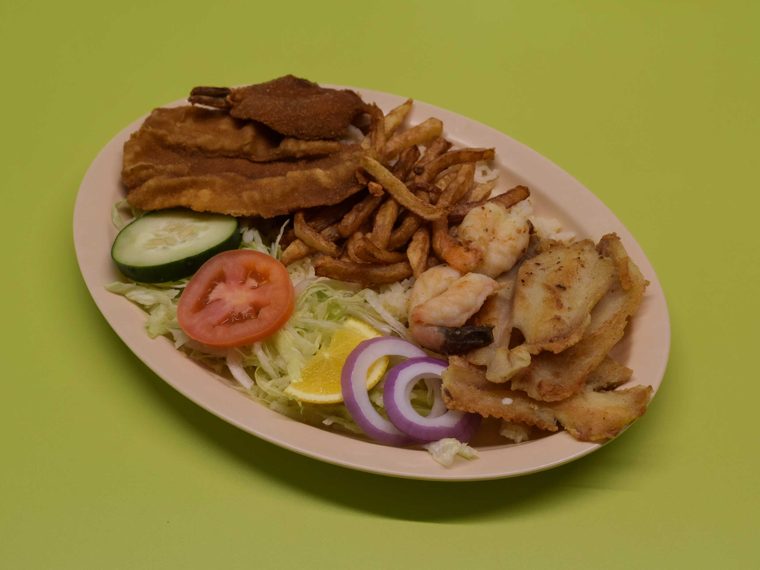 Camarones empanizado, camarones plancha, filete empanizado, filete plancha, chicharrón de pescado, ensalada, papas fritas, arroz blanco.