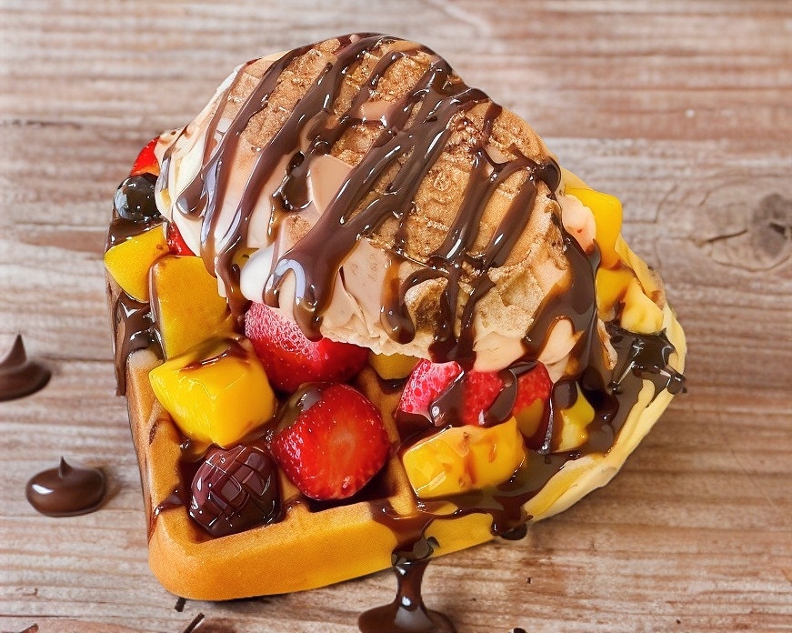 Deliciosos waffles cubiertos con tu ingrediente favorito (Nutella, chocolate Hershey, lechera, mermelada de fresa) con tu fruta favorita (frutos rojos, fresa, Mango, plátano) y nieve de tu sabor favorito (napolitano)