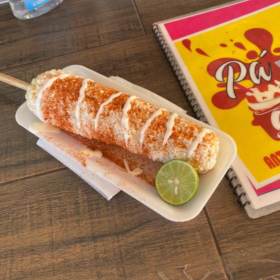 elote entero , con mantequilla , mayonesa queso en polvo , crema y chile limon polvo