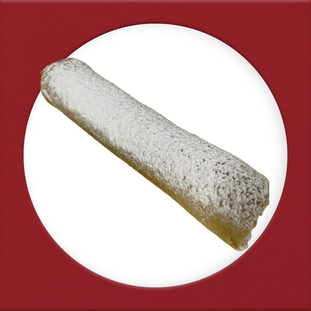 pan en forma de flauta rrelleno de piña espolvoreado con azucar glass