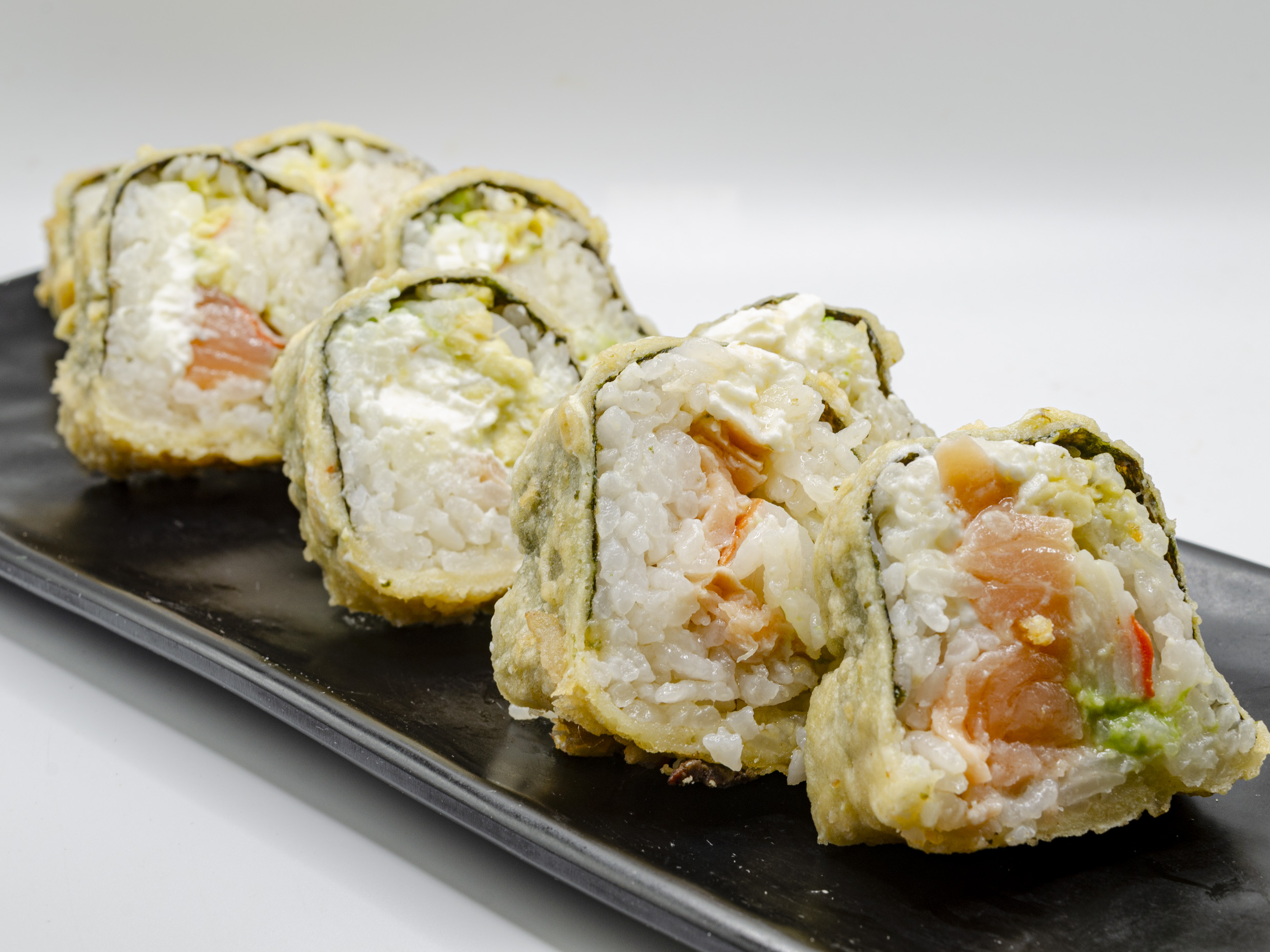 Camarón, Salmon Y Queso Crema Por Dentro. Por Fuera Salsa Dulce Especial Y Mayo Spicy