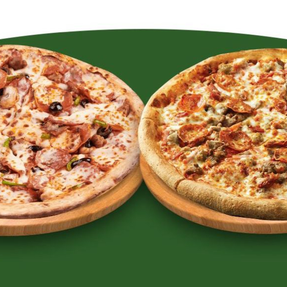 Pizza de pepperoni, salchicha italiana, jamón, champiñones, cebolla, pimiento verde y aceitunas negras, en masa delgada 14"