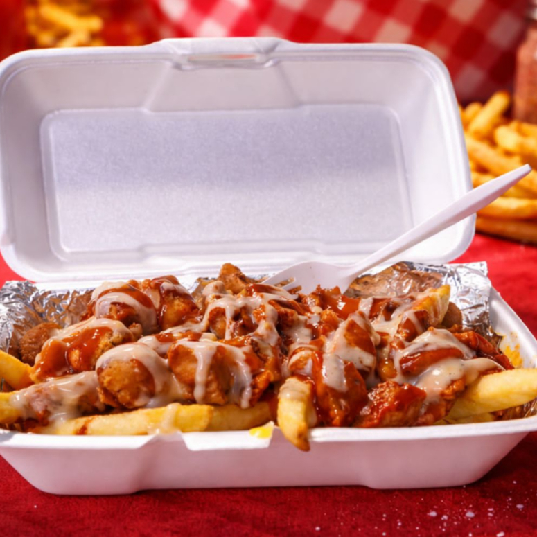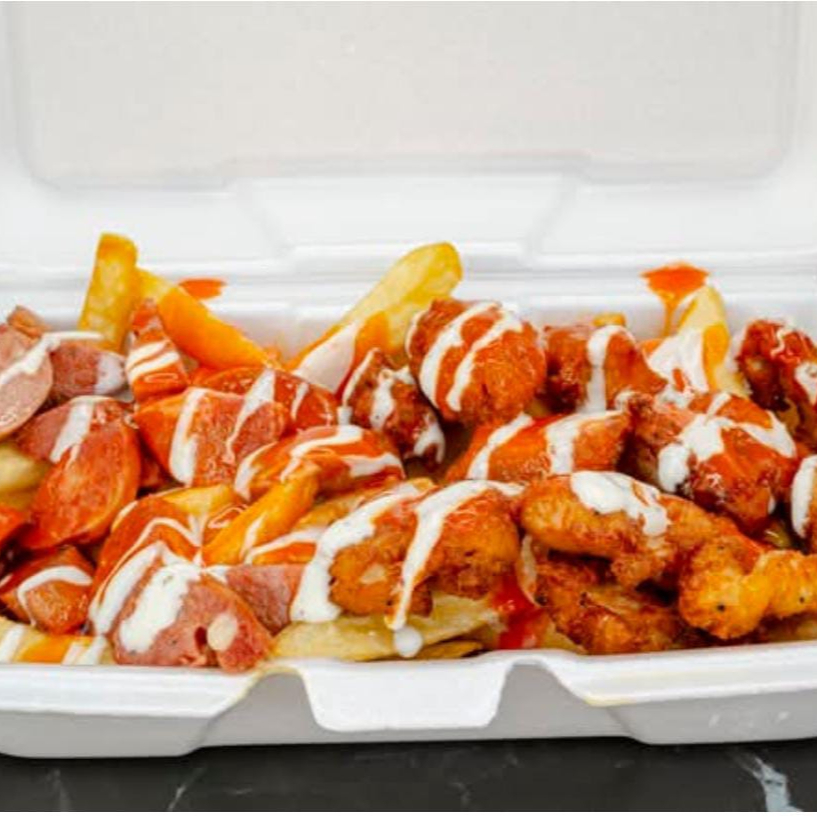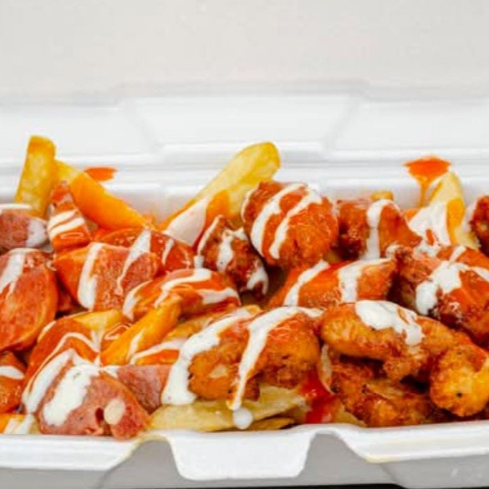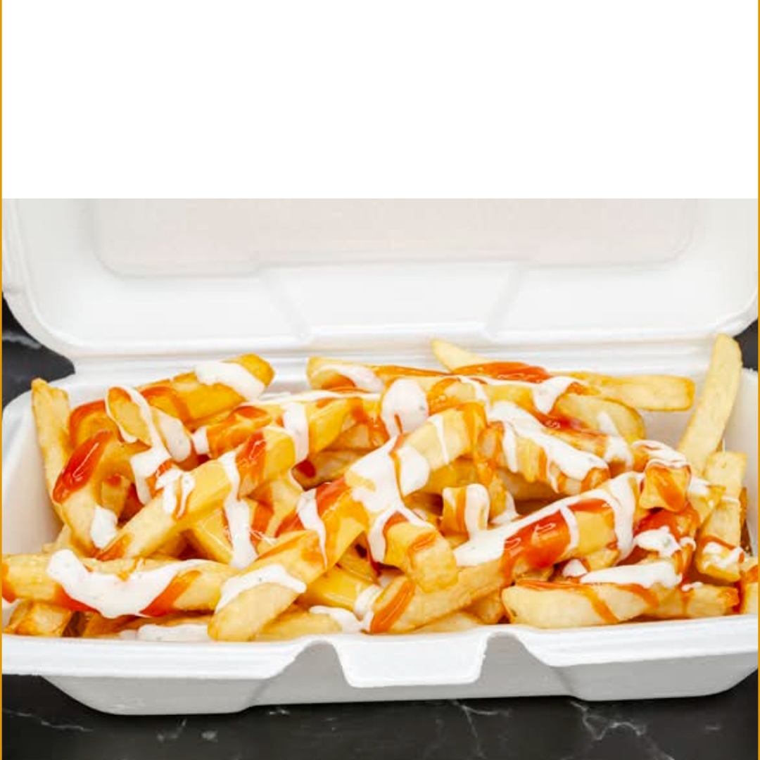 Papas fritas en aceite vegetal bañadas en queso amarillo con dos proteínas y tres aderezos a elegir