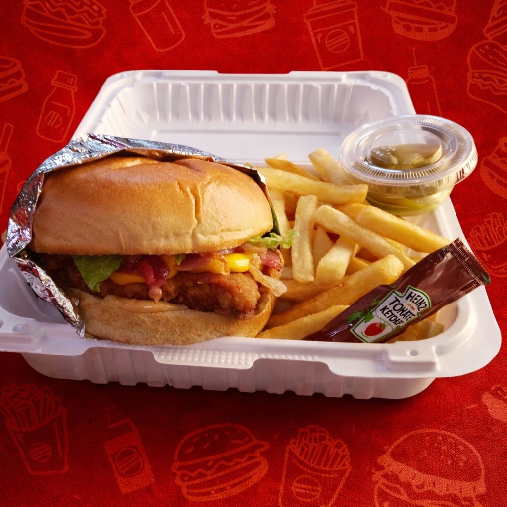 A base de Pechuga de pollo empanizado sofrita en aceite vegetal, con queso amarillo, tocino de cerdo , lechuga, pan blanco y mayonesa con receta de la casa acompañas con papas a la francesa