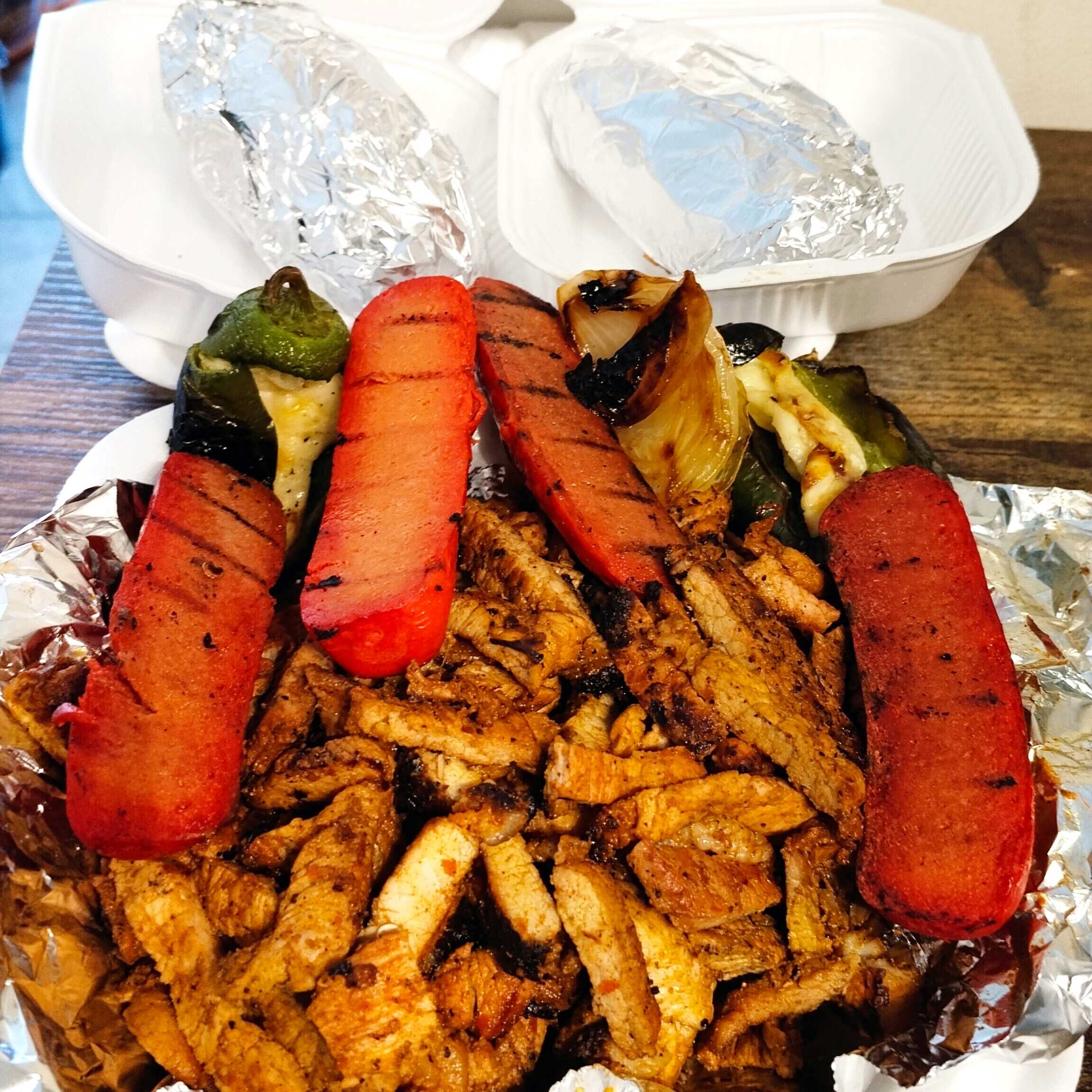 1 Kg de carne al pastor+ 2 salchichas enteras asadas, 2 papas asadas con mantequilla, cebolla asada, salsas,chiles toreados tortillas