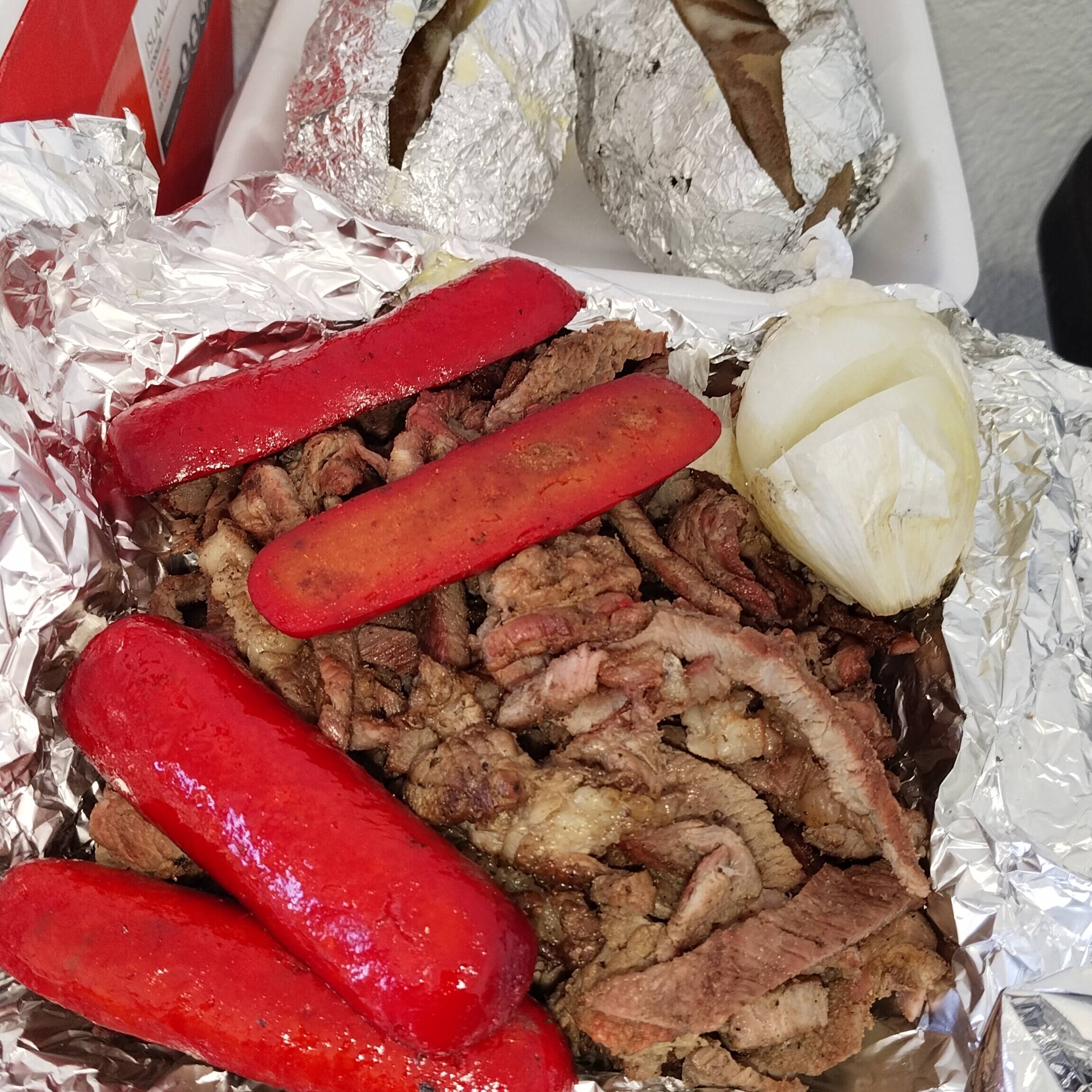 1/2 kg de carne asada sin hueso, 1 papa asada con mantequilla, 2 mitades de salchicha asada, 1 cebollita asada, salsa, tortillas.