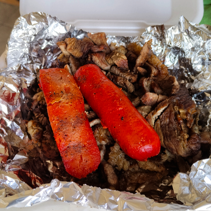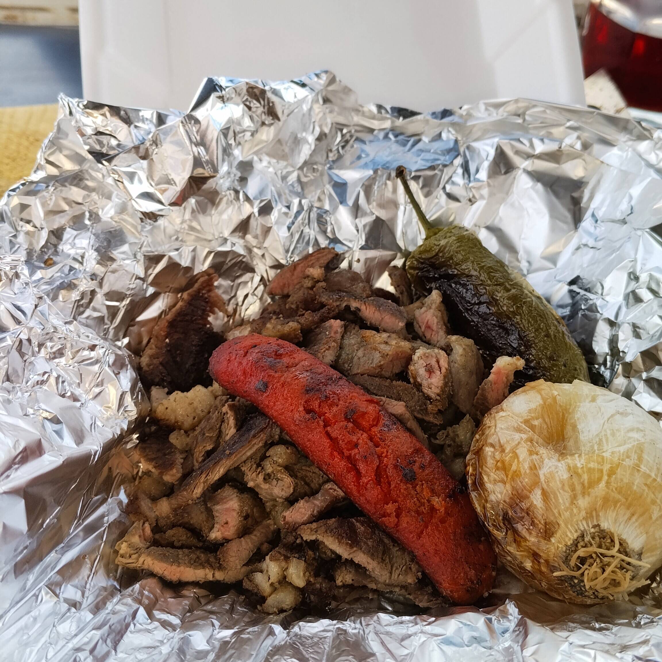 1/4 kg carne asada sin hueso, 1/2 salchicha asada, cebollita asada, 2 chiles toreados, salsas, tortillas.