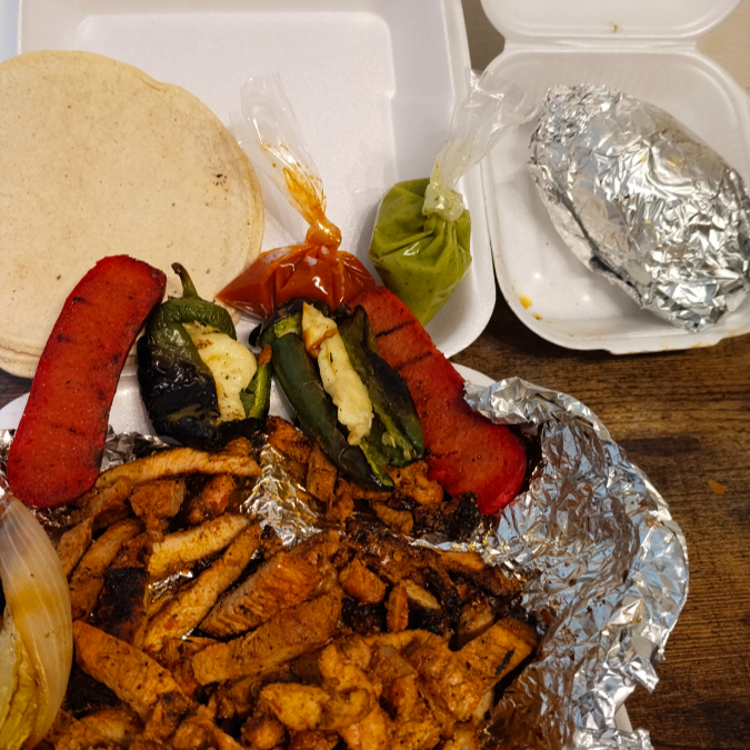 1/2 kg carne de res asada, 1/2kg de carne al pastor, 2 papas asadas con mantequilla, 2 chiles toreados, salsas, cebolla asada , tortillas