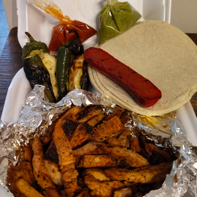 1/4 Kg carne al pastor, 1/2 salchicha asada, 2 chiles toreados, cebolla asada, salsas y tortillas