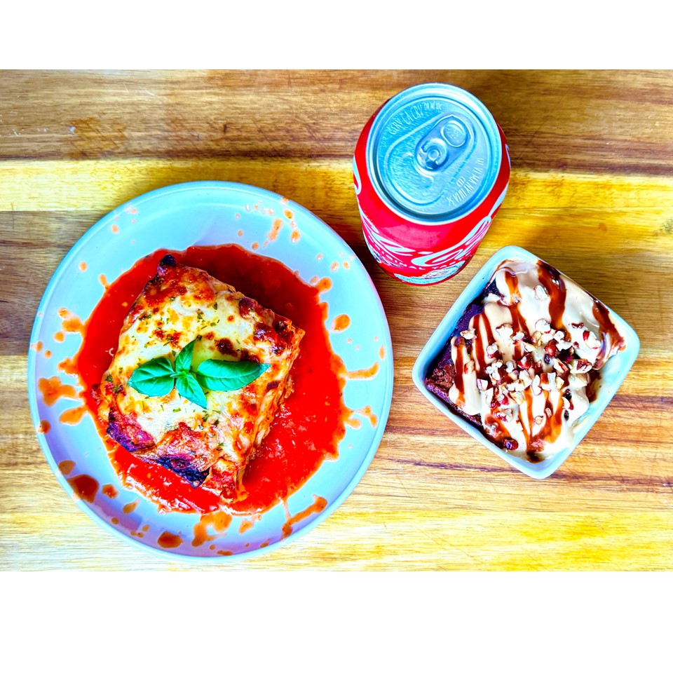 Combo especial con lasaña en porción individual de 250g-300g, acompañada de un refresco a elegir y un postre de temporada, práctico y económico, ideal para casa u oficina sin perder sabor ni calidad. Incluye Pan de Ajo.