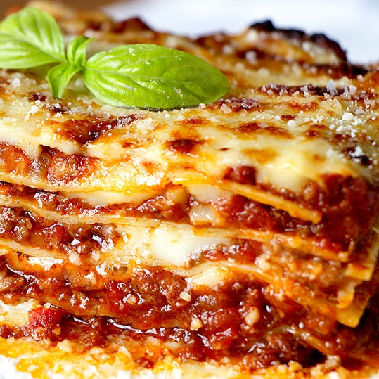 Múltiples capas de pasta hecha en casa, salsa bolognesa, mezcla de quesos y crema bechamel. Bañada en una salsa pomodoro de tomates san marzano, 450 g aprox.