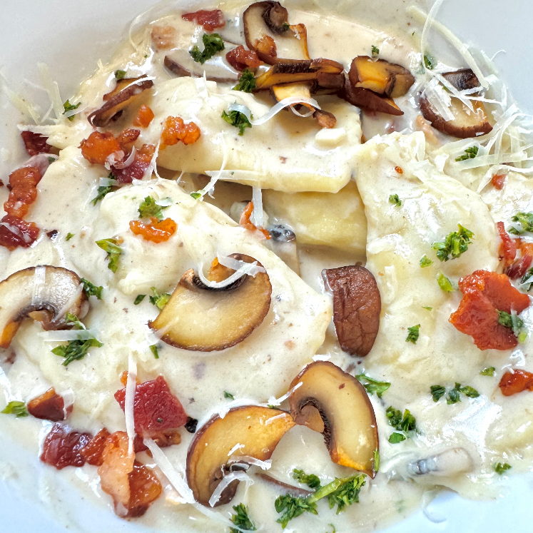 Ravioli de 3 Quesos en Crema de Tocino y Champiñon