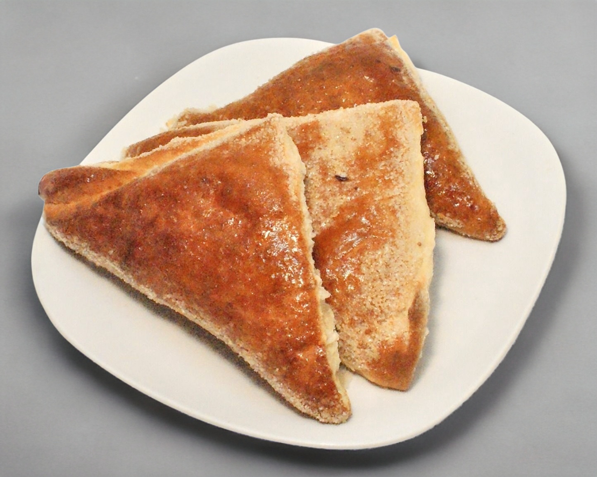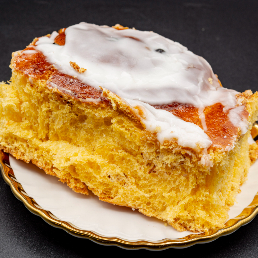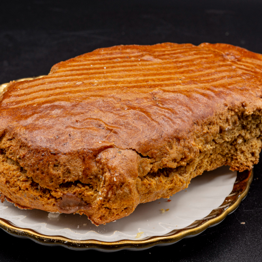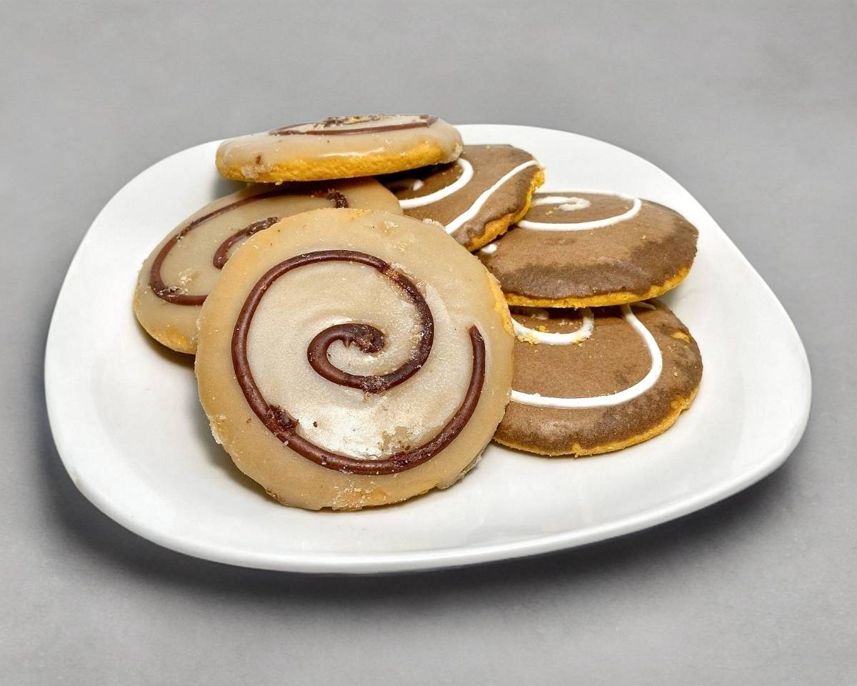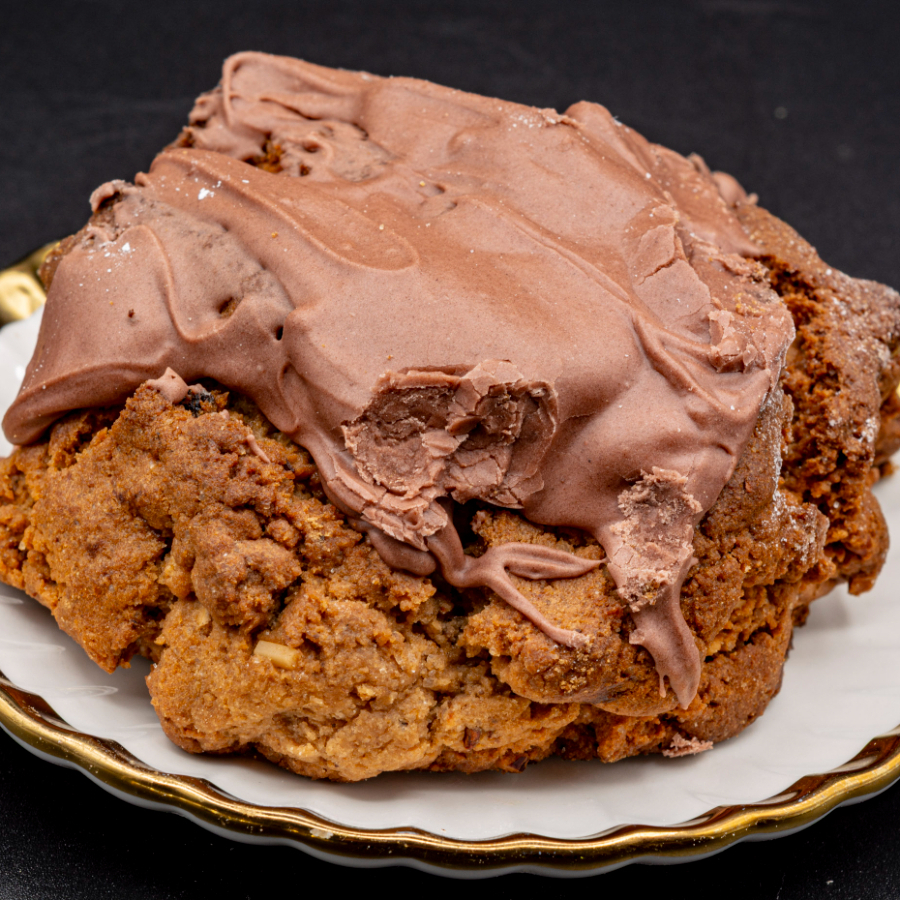 Pan piedra con pasas, nuez, coco y glaseado de chocolate.