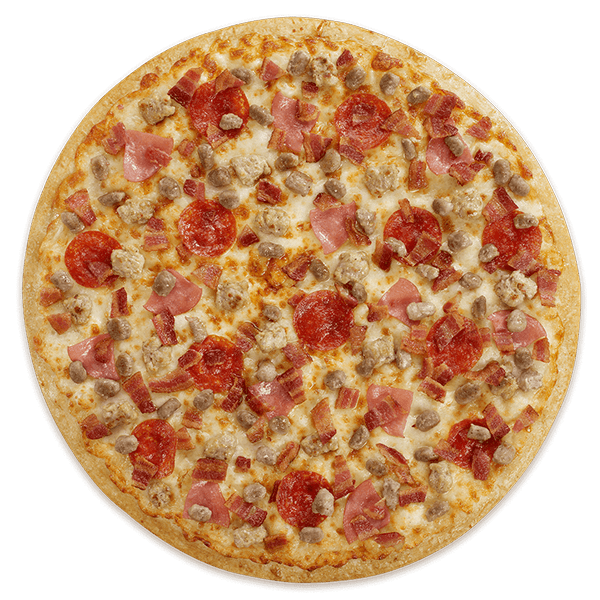 Peperoni, champiñones, jamon, carne, pimiento verde, aceitunas negras y cebolla morada