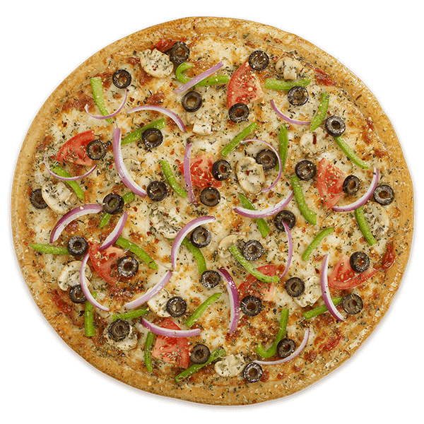 Champiñones, pimiento verde, cebolla, aceitunas negras, rodajas de tomate y especias clasicas
