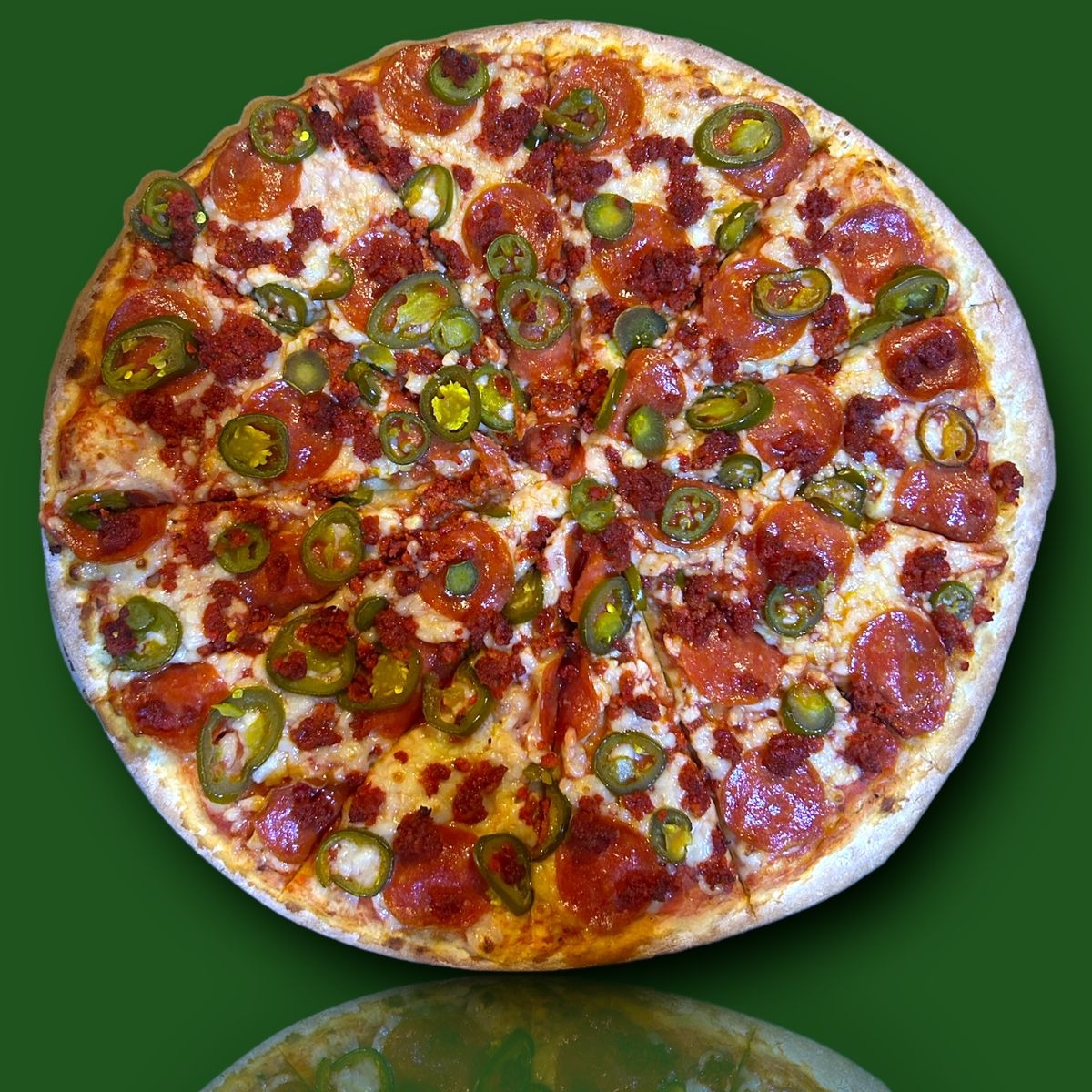 Pizza 12 rebanadas con (Carne, Chorizo, Jalapeño)