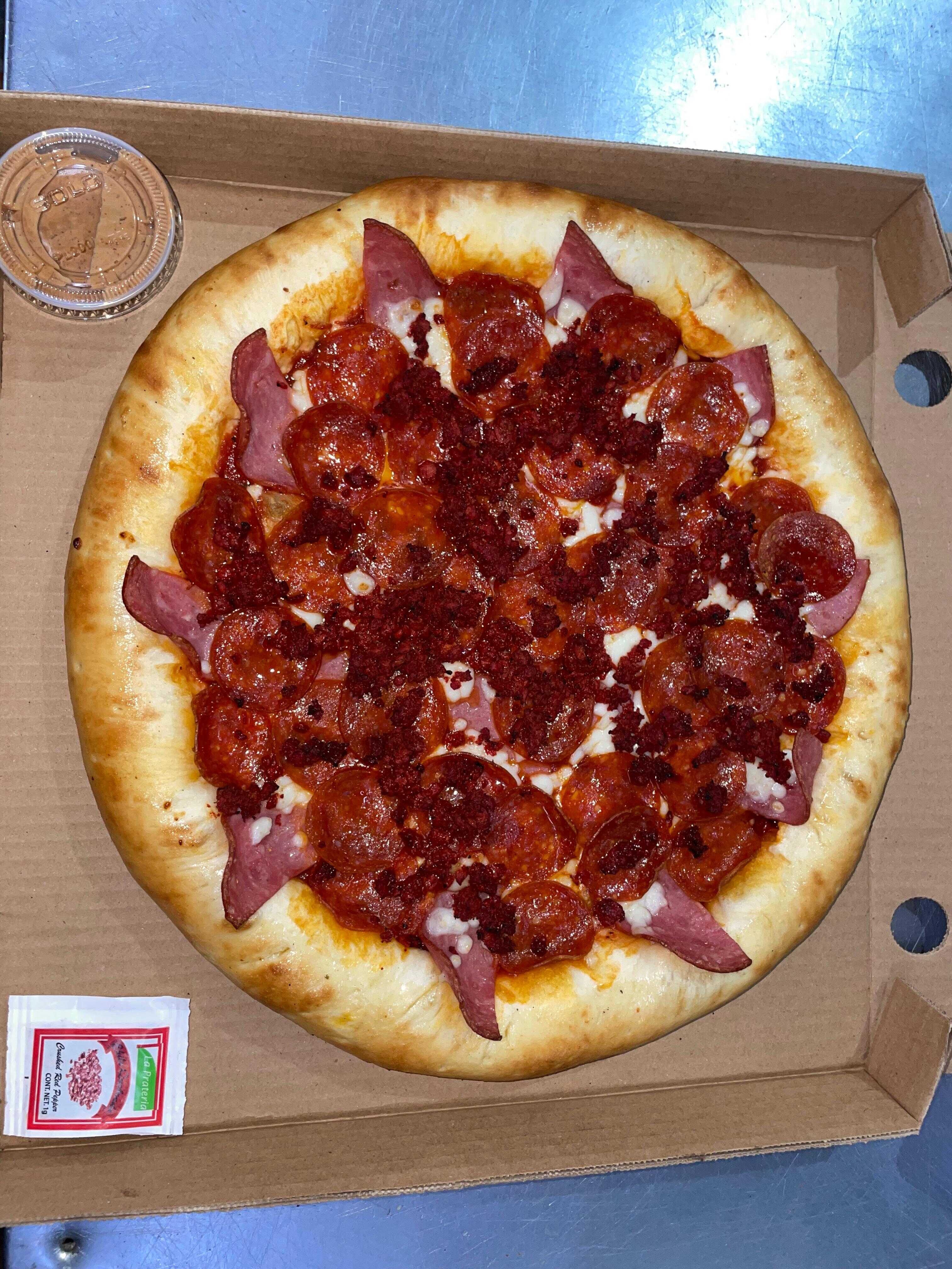 1 Pizza Grande 14" con ½ de Peperoni y la otra mitad de ½ Peperoni, Carne, Tocino