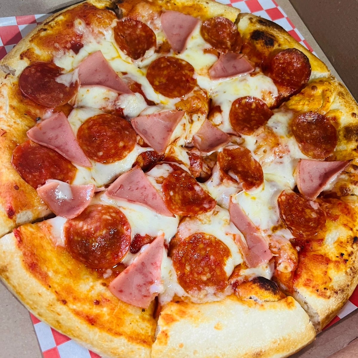Salsa de tomate,queso mozarella,peperonie y jamon.