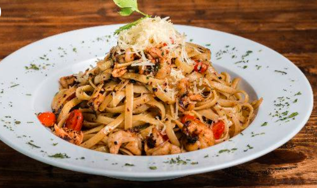 Relleno de queso mozzarella, jamón, bañada al gusto sobre una cama de fetuccini
