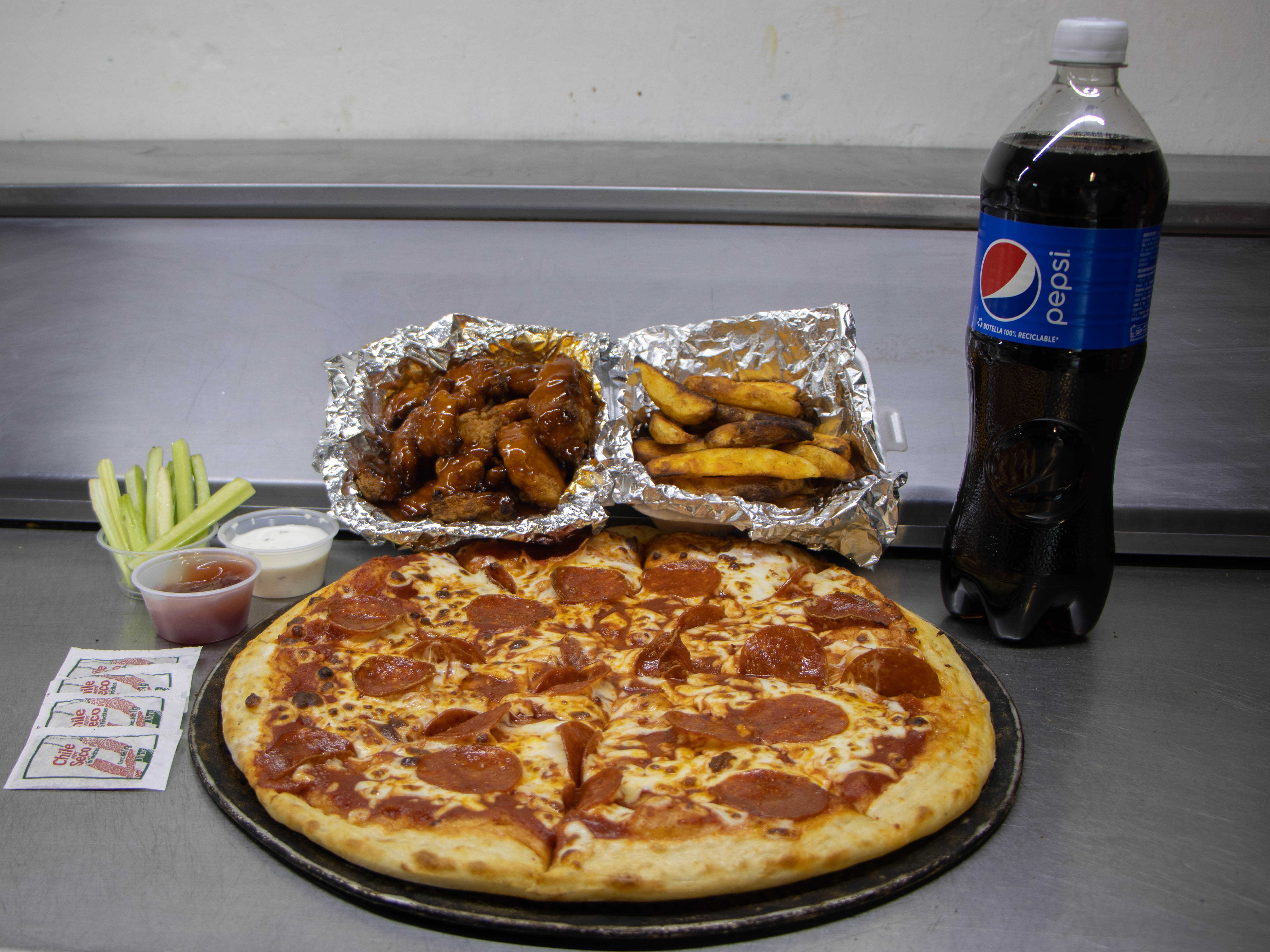 Combo Pizza Extragrande+ papas+refresco+alitas
