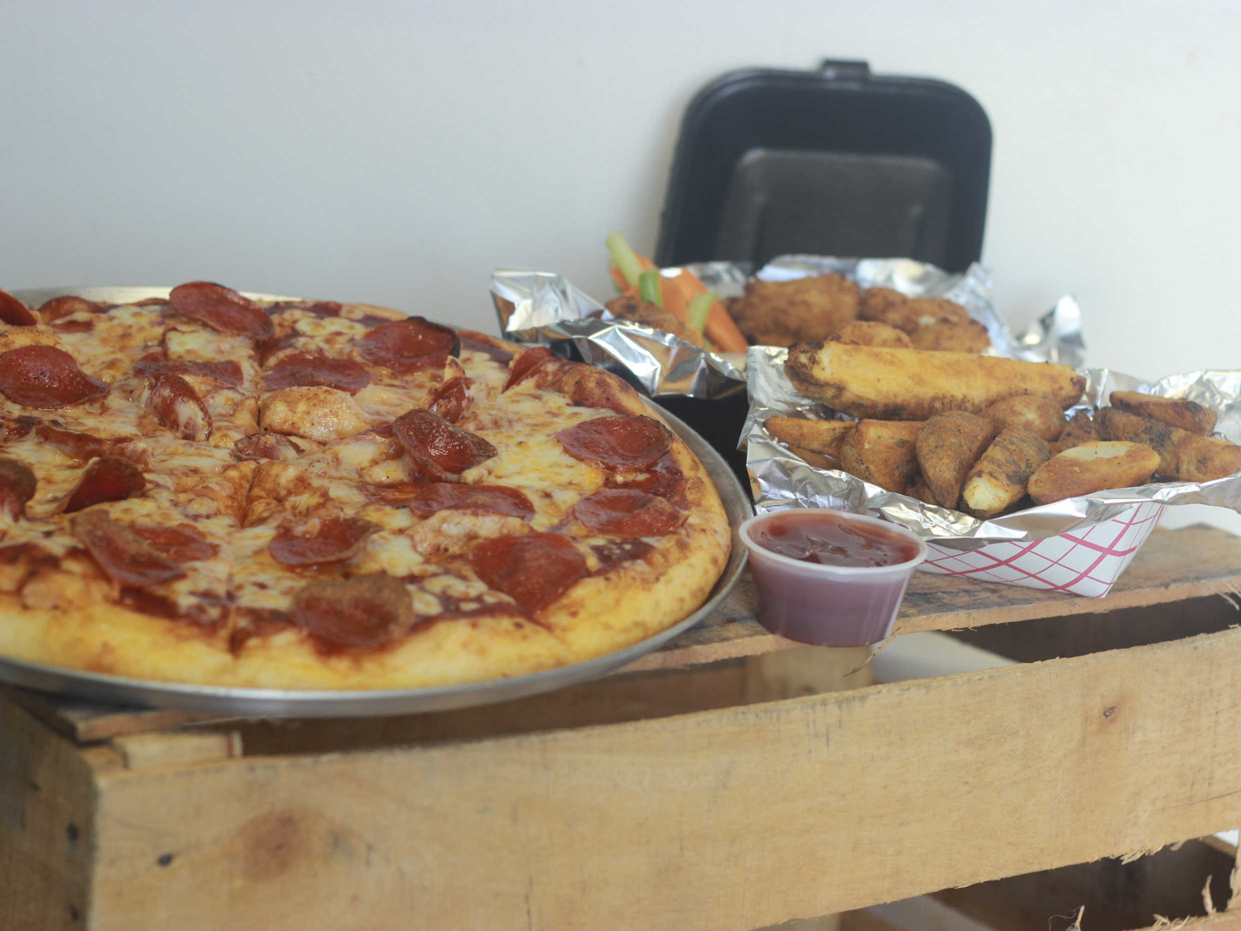 Pizza Grande 14 Pulgadas*1 + Alitas o Boneless **1 + Papas Gajo Sazonadas **1 + Refrescos **1 + Aderezo*1