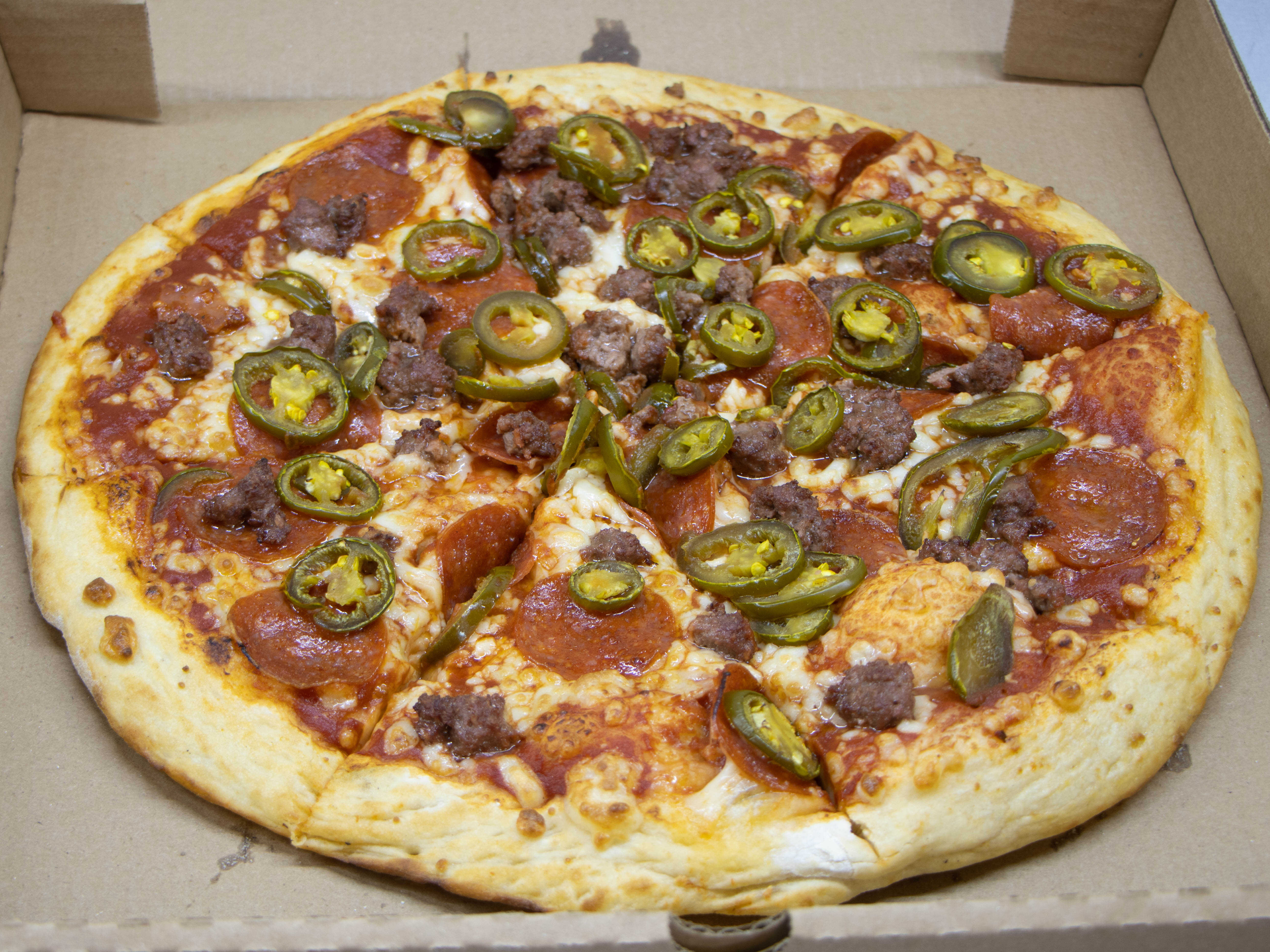 PIZZA EXTRA GRANDE CON CARNE, CHORIZO Y JALAPEÑO