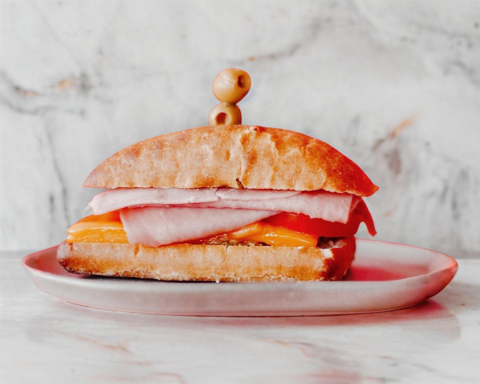 Jamón de pierna + Queso cheddar + tomate + queso crema + pesto de albahaca