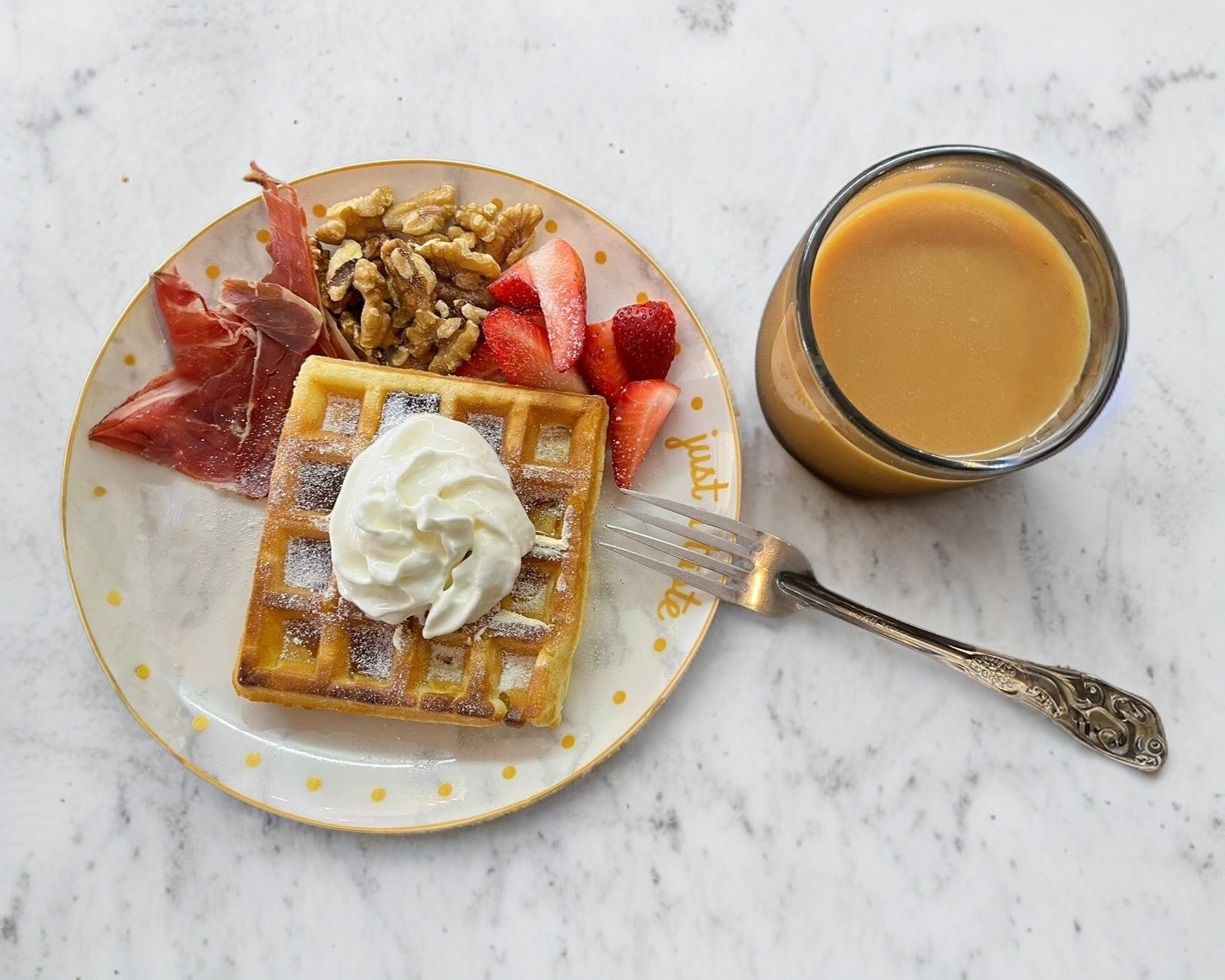 2 Waffles esponjositos acompañados de fresas o blue berries y nuez de castilla