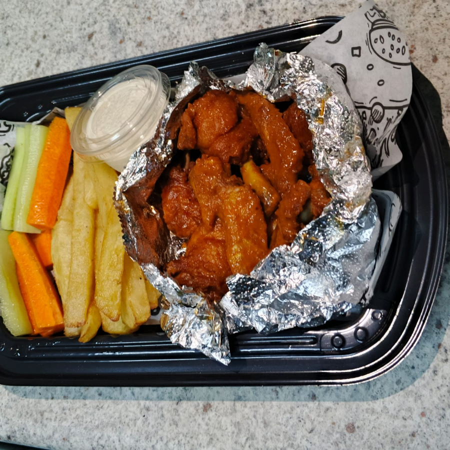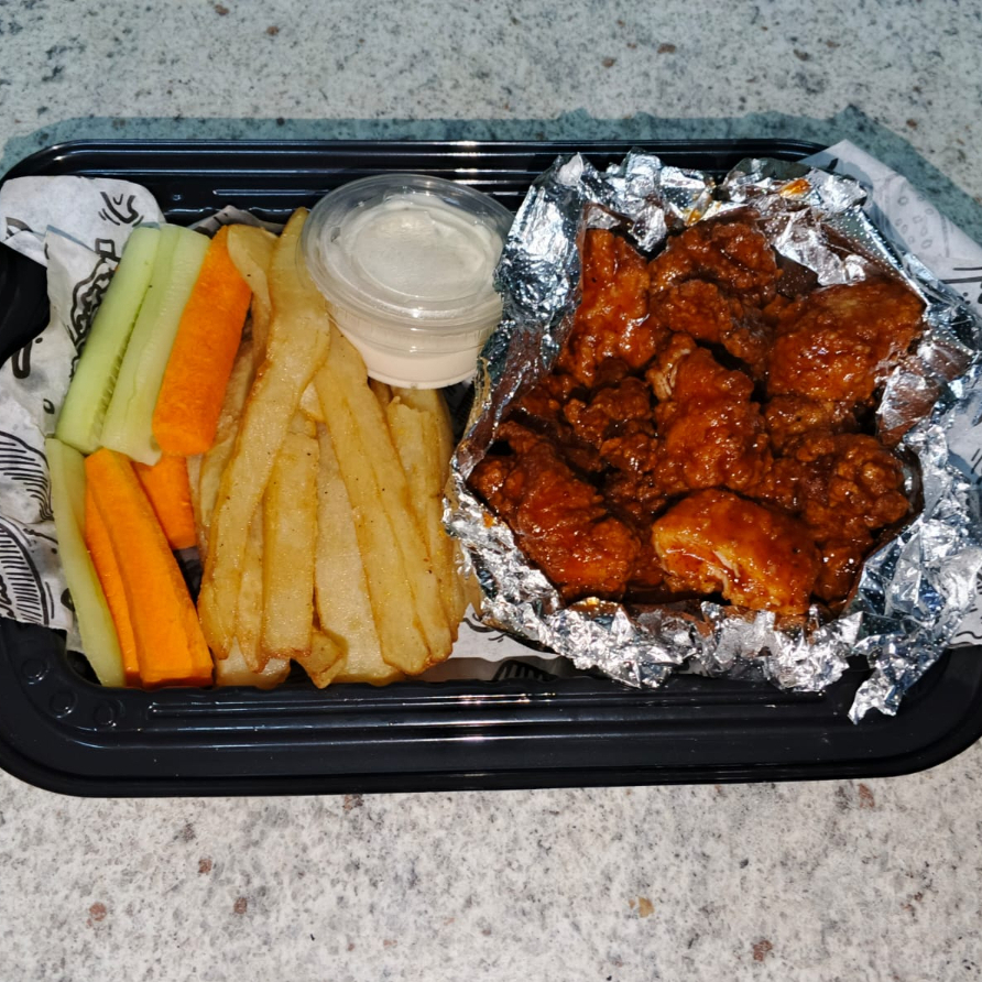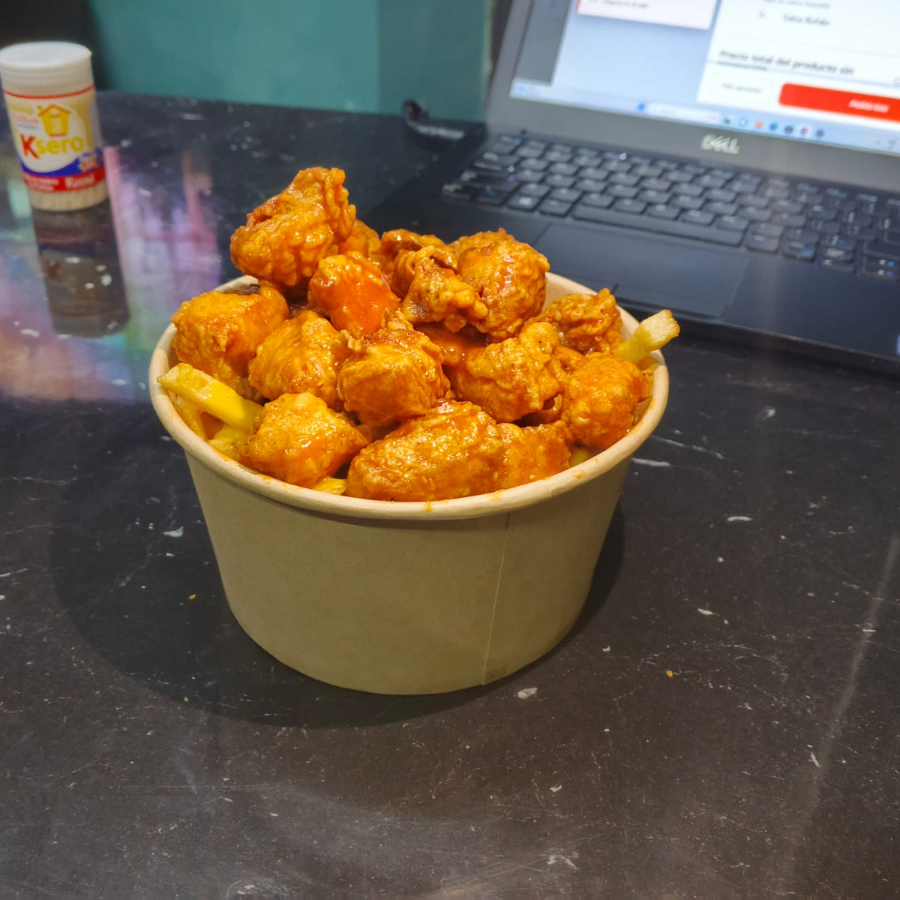 200g en crudo de boneless y 250 g de papas con aderezo de queso, chipotle cremoso, y papas zasonadas con tus papitas preferidas