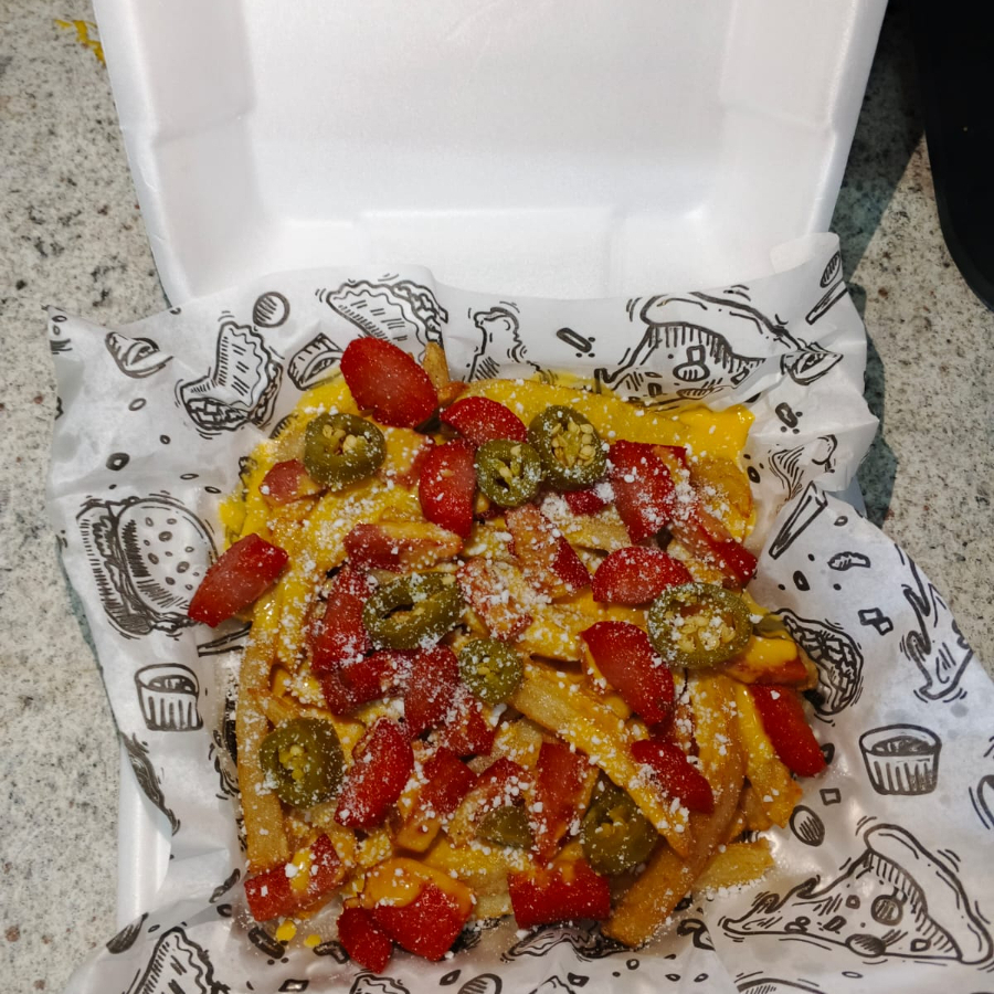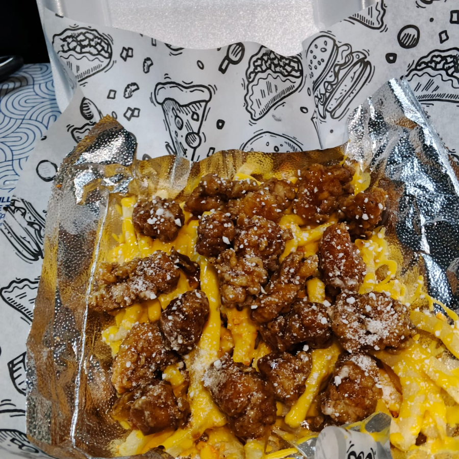 250g de pechuga cortada en trozos bañadas en salsa al gusto con papas fritas bañadas de queso amarillo,queso en polvo,curtidos