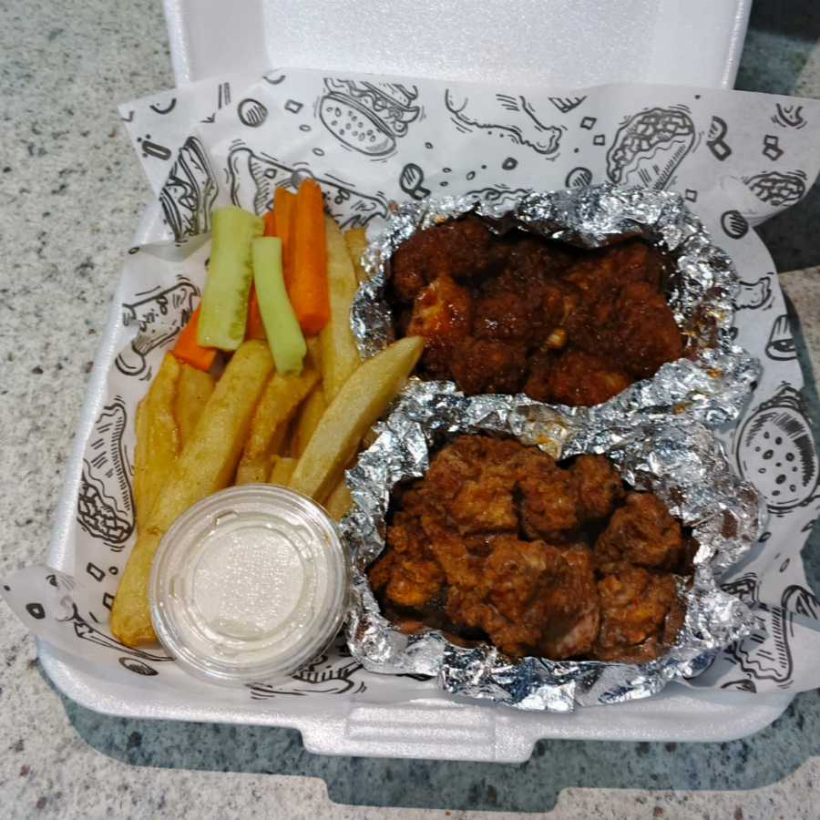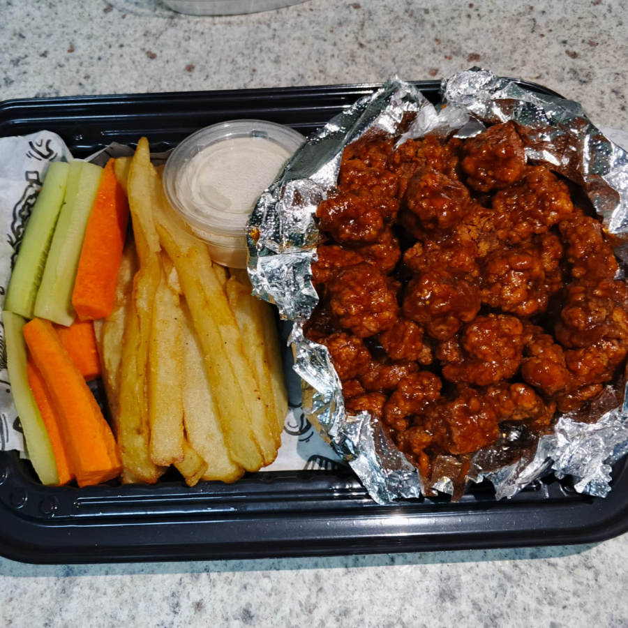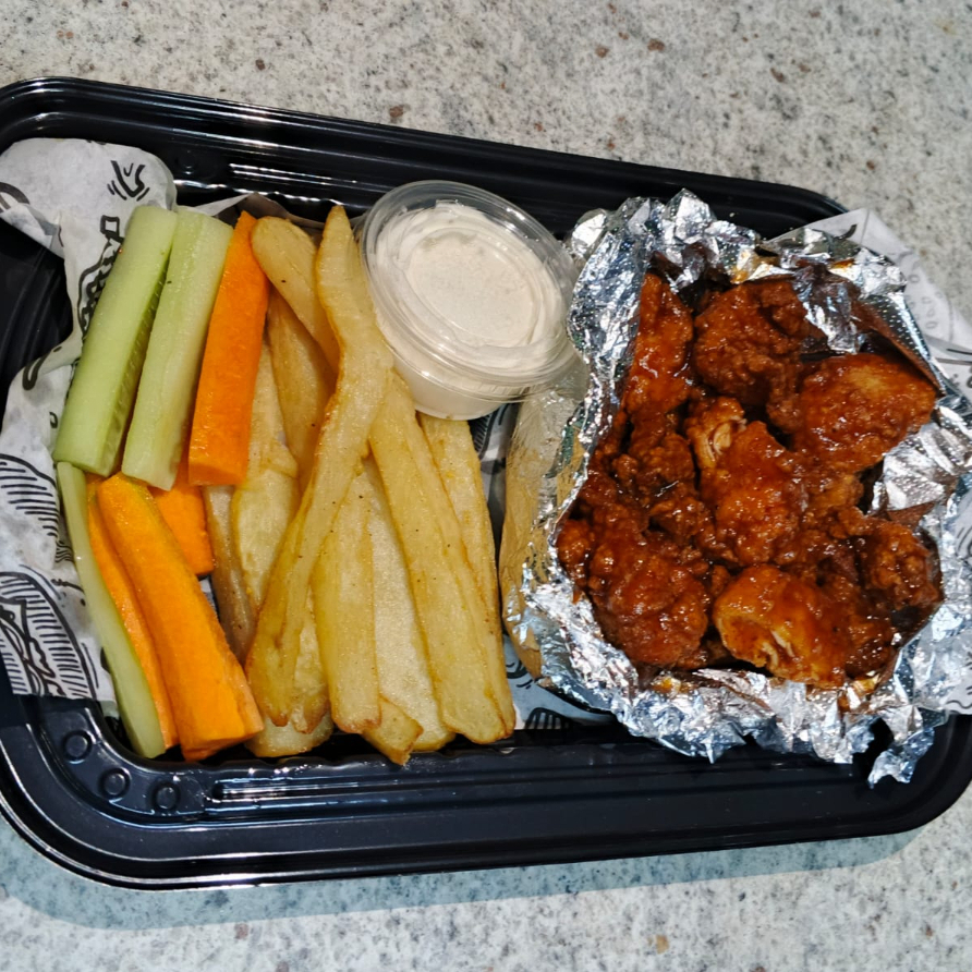 250g en crudo con 200g de papas con verdura y aderezo puedes combinar los sabores, bbq,bbq hot,habanero,alitas,ajo parmesano,tamarindo,naranja chipotle,pimienta limon.