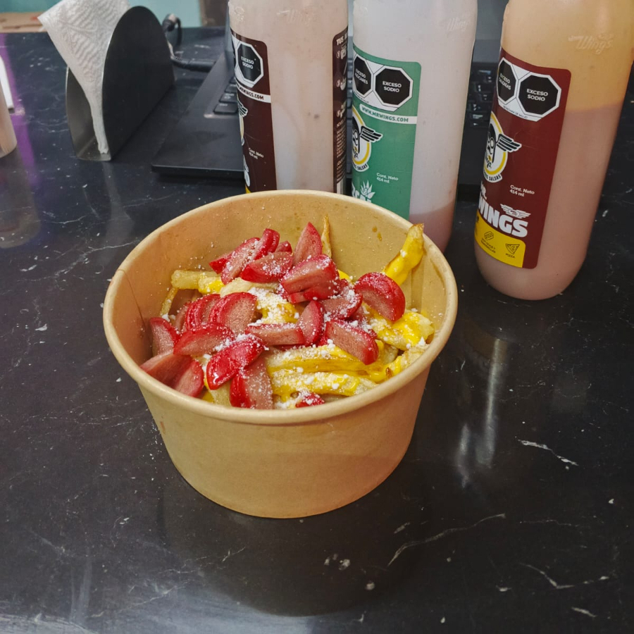 250g de puerco 150g de papas con verdura y aderezo puedes combinar los sabores, bbq,bbq hot,habanero,alitas,ajo parmesano,tamarindo,naranja chipotle,pimienta limon.