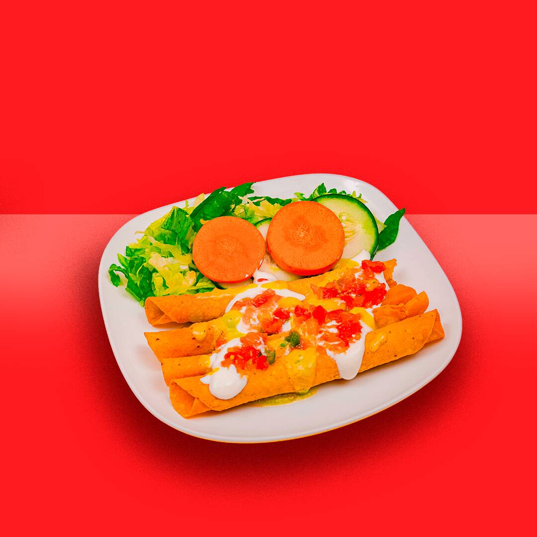 Orden de 4 flautas de pollo; incluye ensalada, salsa y crema.