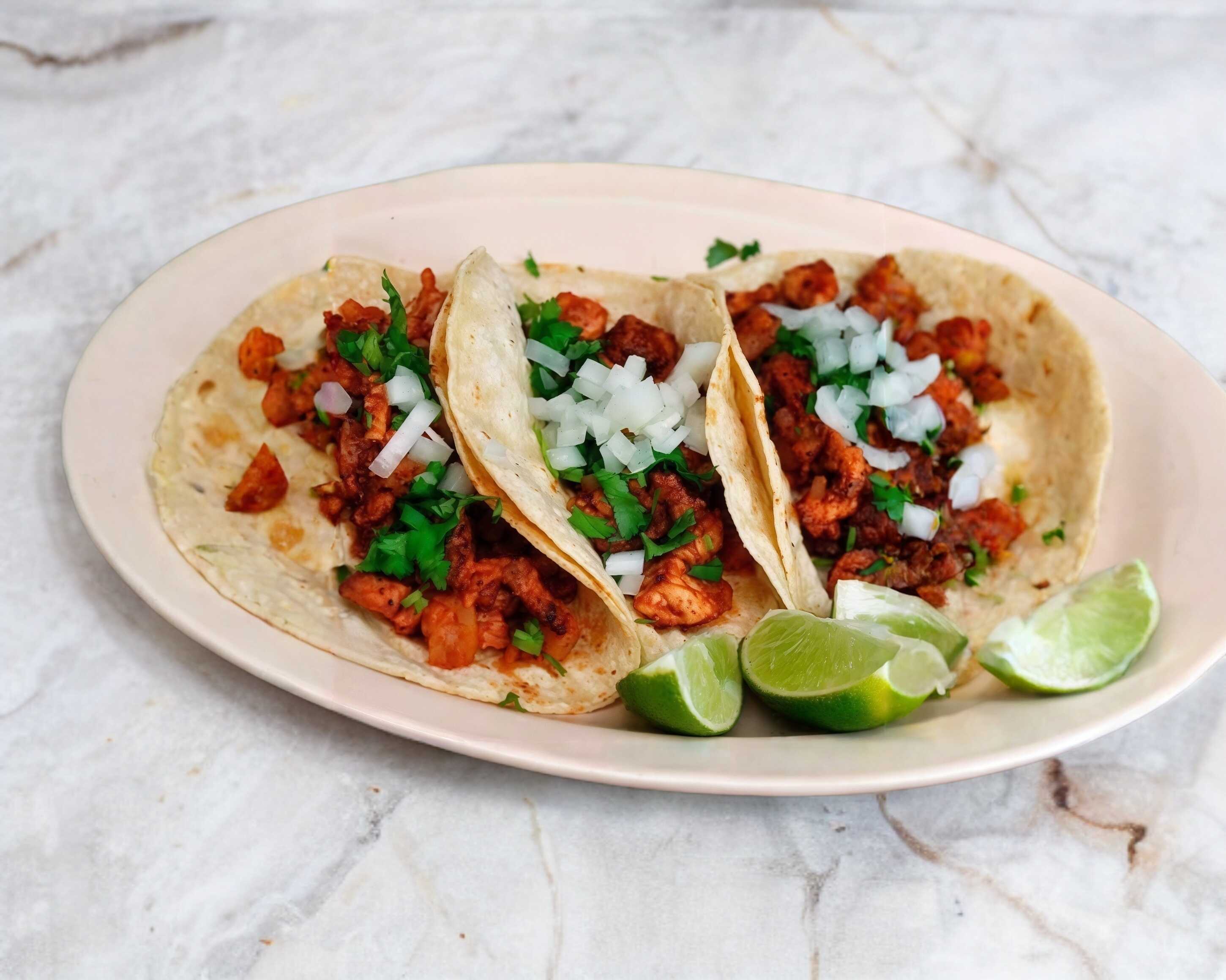 CARNE PASTOR, SALSA DEL DIA, LECHUGA, CEBOLLA CON CILANTRO, LIMON